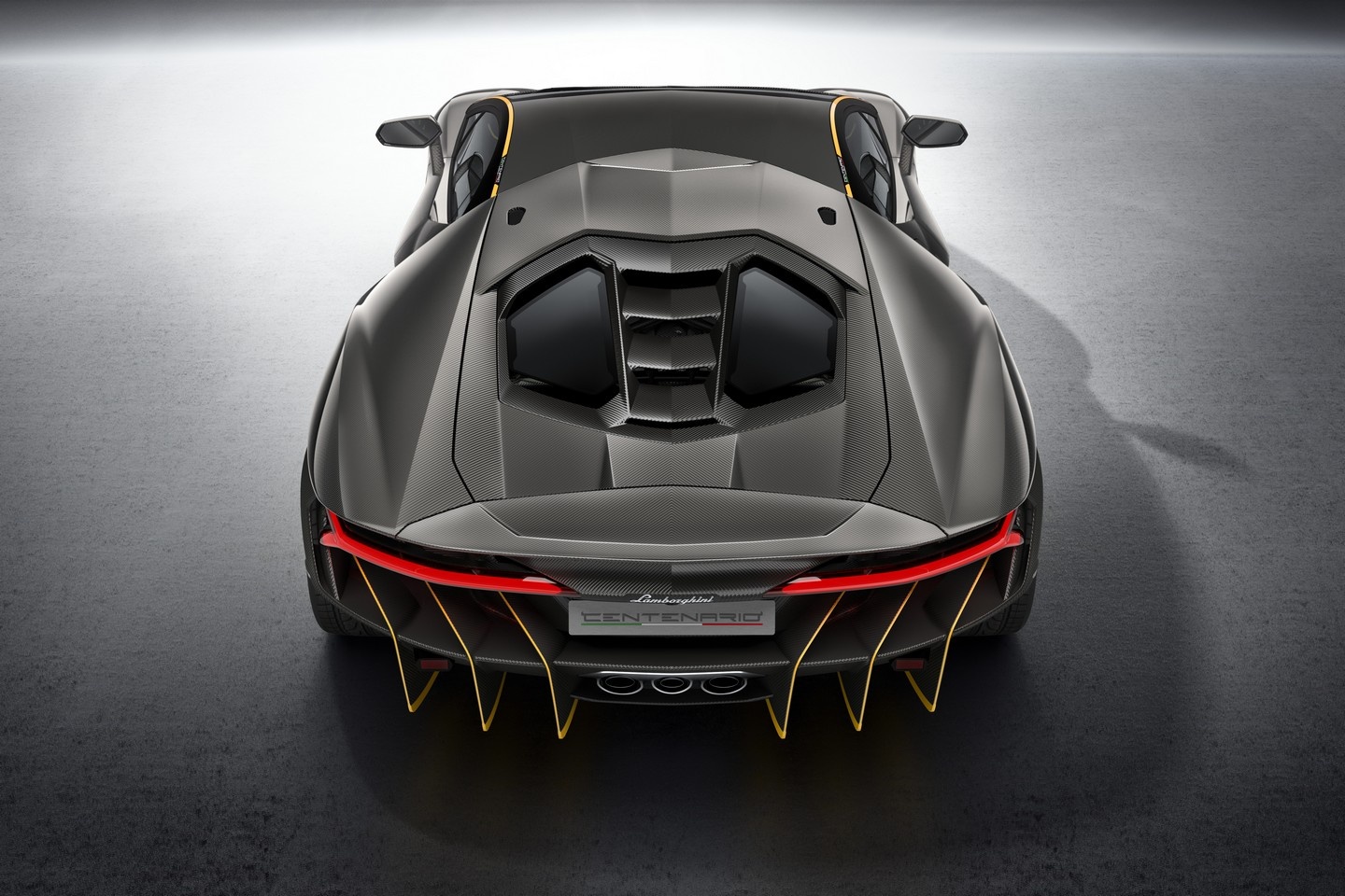 | Mang thiết kế vay mượn từ Aventador SV, Centenario sở hữu đường nét dữ dằn hơn và khoác lớp áo 100% sợi carbon để giảm tối đa trọng lượng. Xe chỉ nặng 1.520 kg, tương ứng tỷ lệ 1,97 kg/mã lực. Thiết kế đó không chỉ giúp Centenario khỏe khoắn và đẹp mắt hơn, nó còn kết hợp với cánh gió phía sau giúp xe đạt tính khí động học cao nhất. |