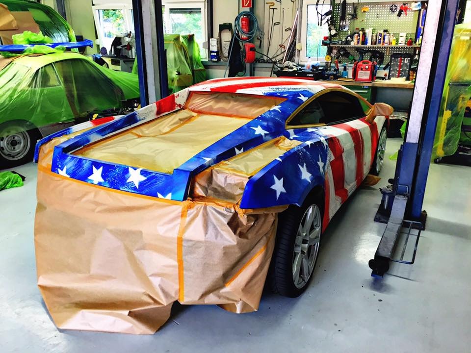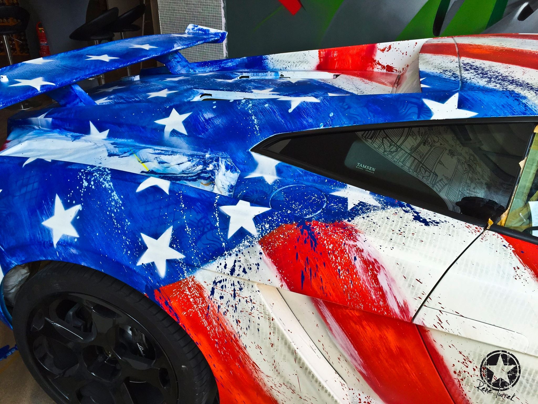 Xe nguyên bản có màu trắng. Đầu tiên, Turrek sơn xe theo họa tiết Quốc kỳ Mỹ tương tự mặt khiên của Captain America. Các sọc trên lá cờ được tạo ra bằng nhiều kỹ thuật vẽ khác nhau, nhưng chủ yếu là dùng cọ vẩy mực lên thân xe.