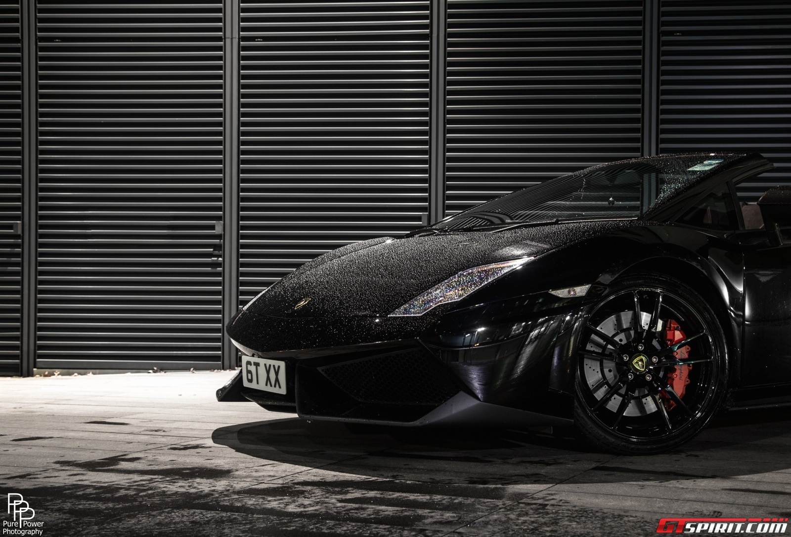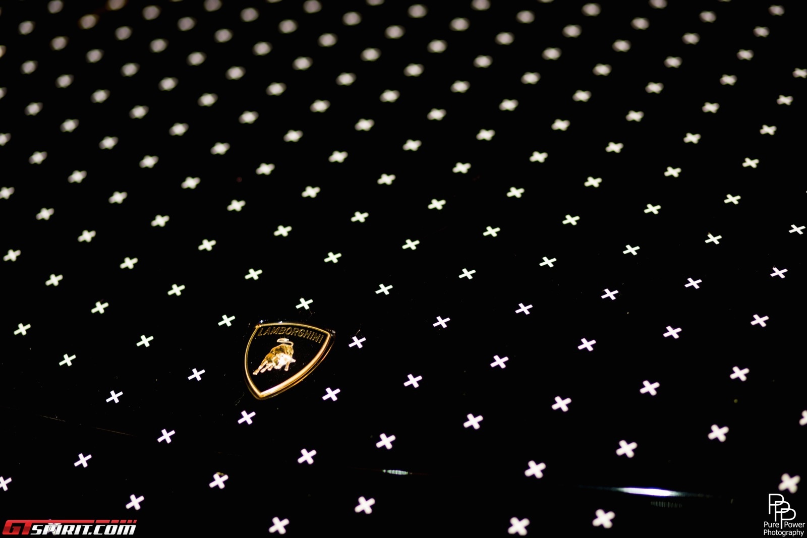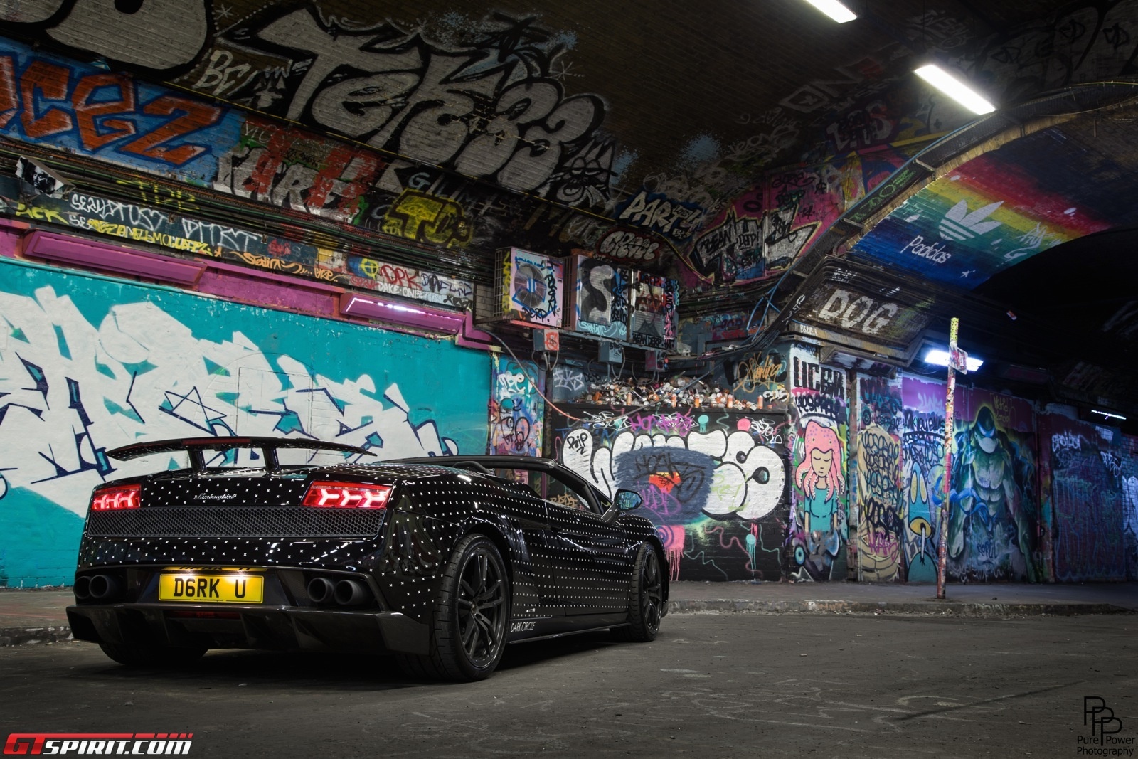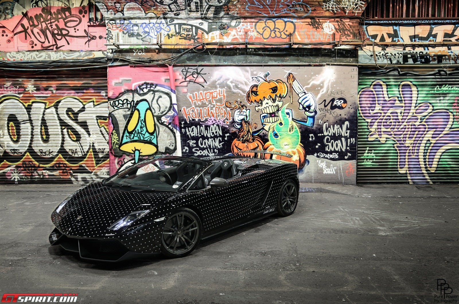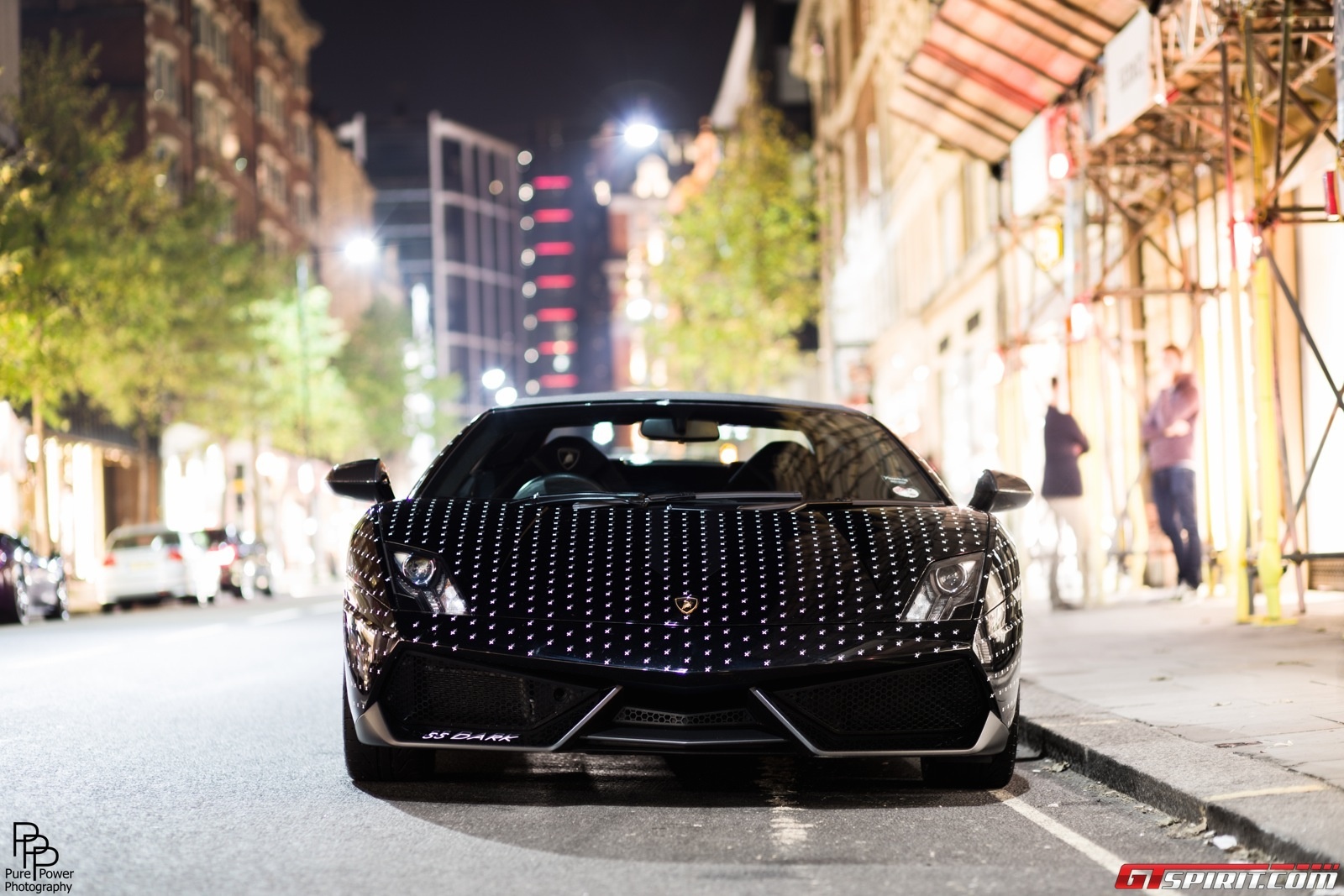 Siêu xe Lamborghini Gallardo LP570-4 Performante trong bộ ảnh này khoác trên mình bộ cánh độc đáo, gồm những dấu cộng (+) màu trắng nhỏ, trên nền sơn đen bóng.