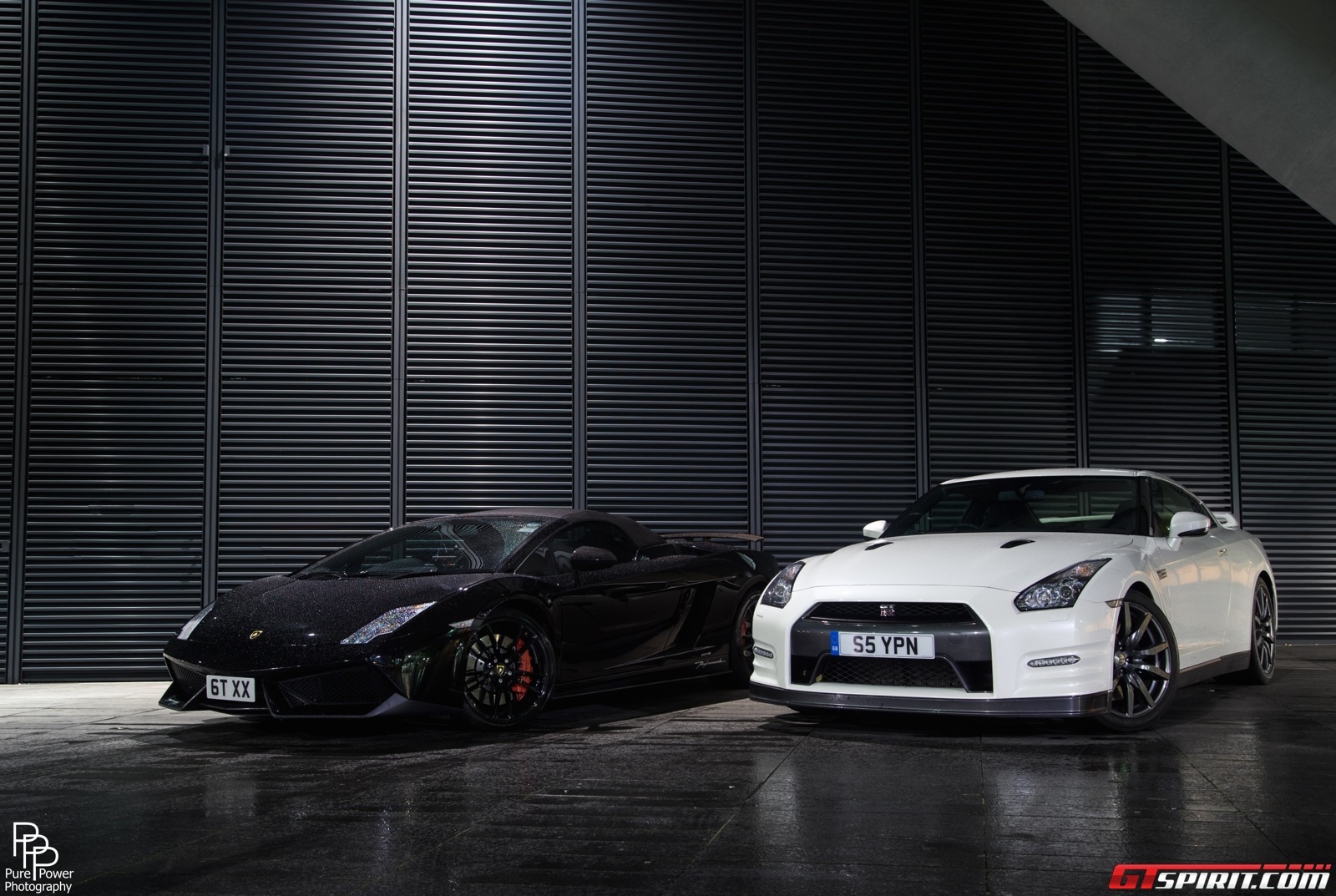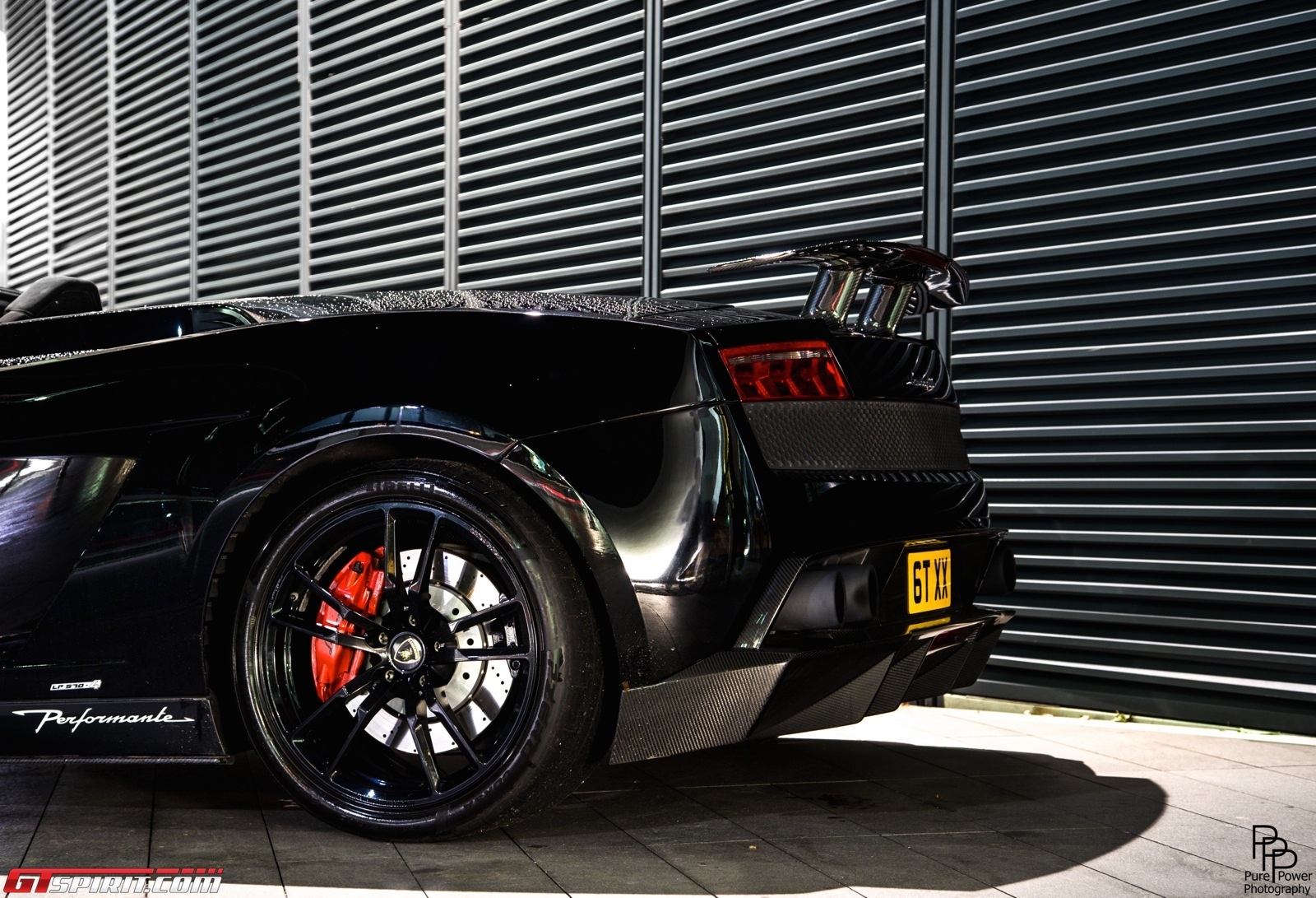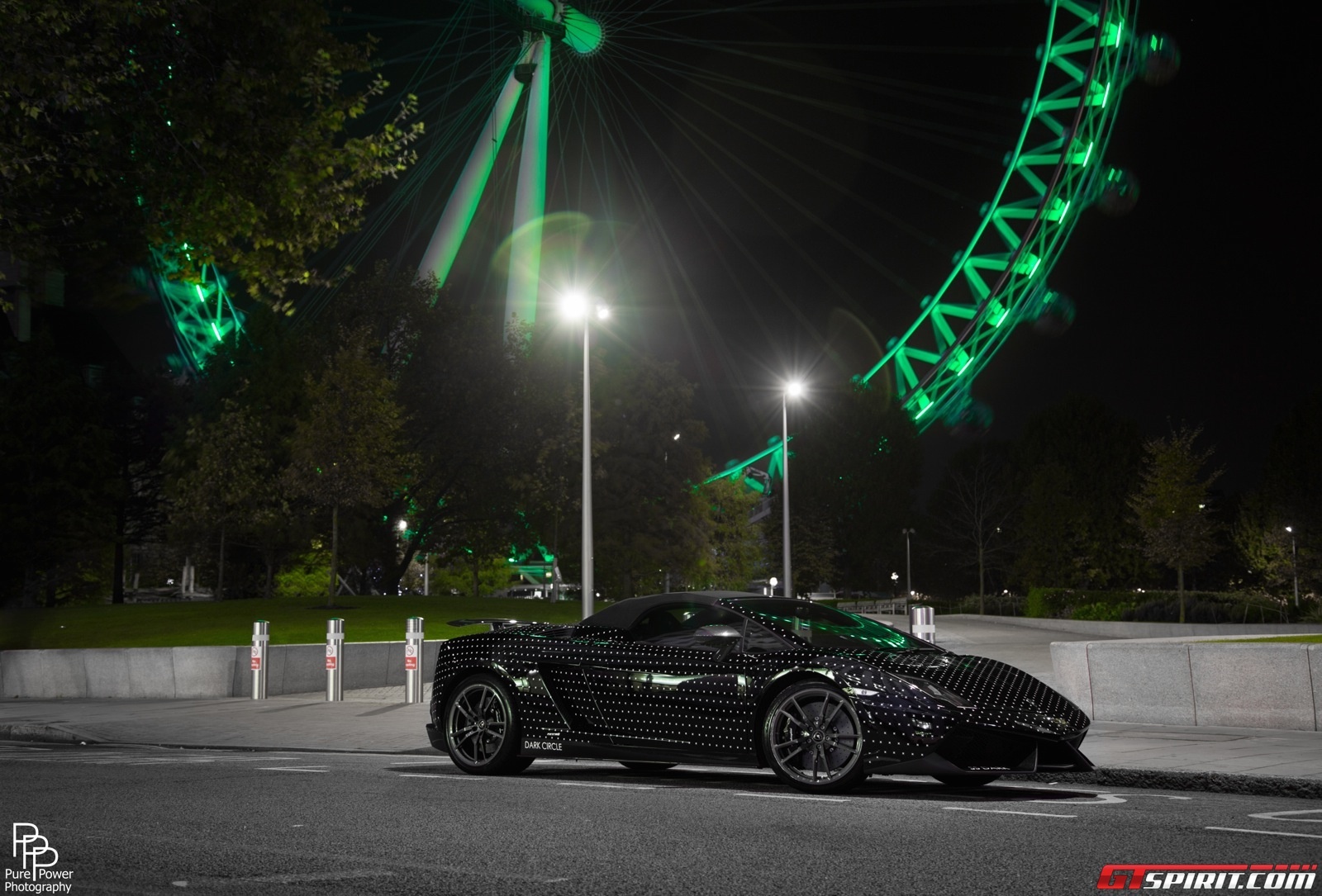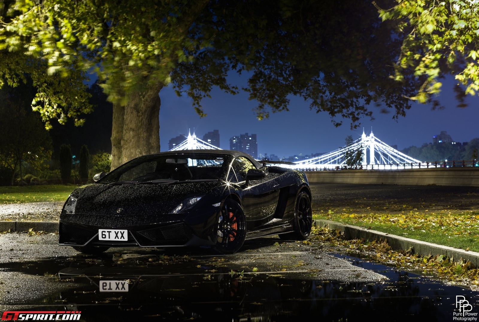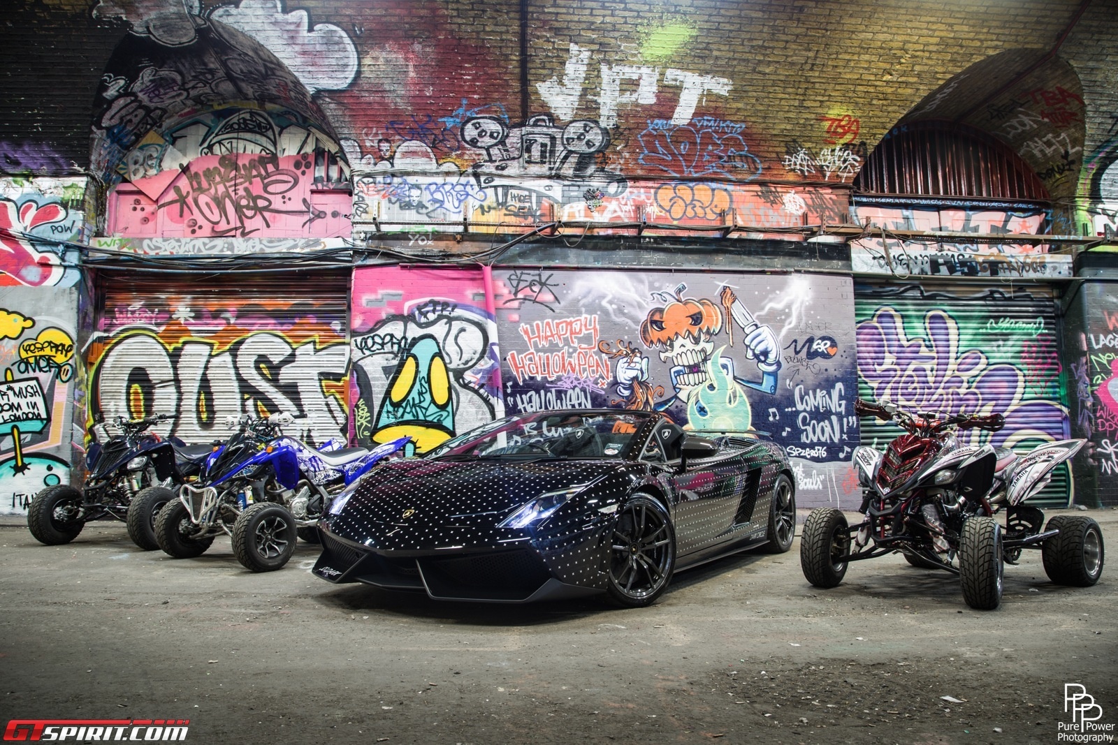 Siêu xe Lamborghini Gallardo LP570-4 Performante trong bộ ảnh này khoác trên mình bộ cánh độc đáo, gồm những dấu cộng (+) màu trắng nhỏ, trên nền sơn đen bóng.