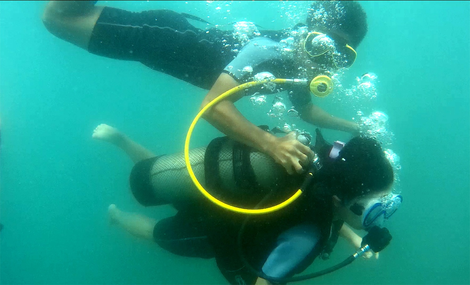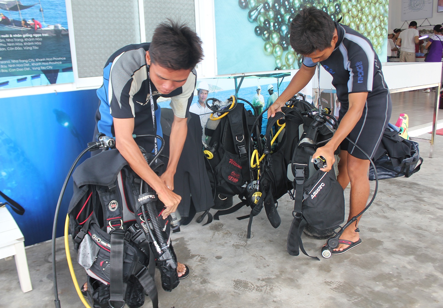 | Trước khi lặn, kỹ thuật viên sẽ hướng dẫn cách sử dụng thiết bị, cách thở, xử lý một số sự cố dưới nước cho khách. Lần đầu tham gia lặn, hầu hết mọi người đều lúng túng. |