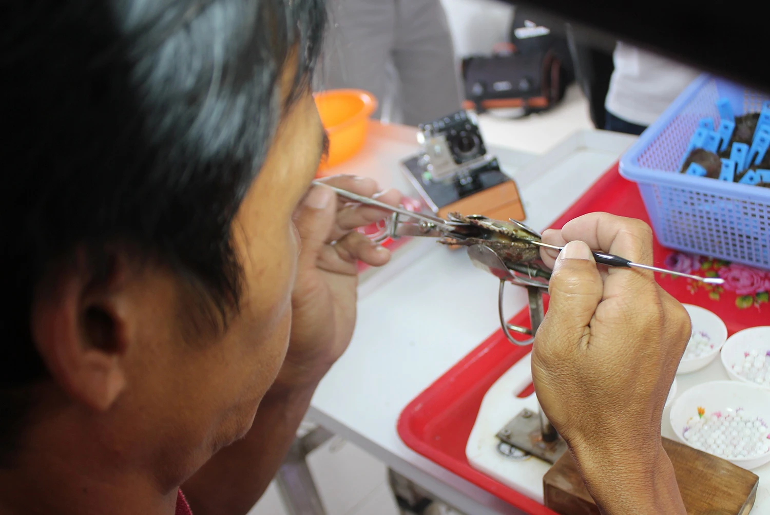 | Sau khi bắt trai lên bờ, nhân viên kỹ thuật sẽ hướng dẫn khách lấy ngọc để gia công thành những món trang sức đơn giản. |
