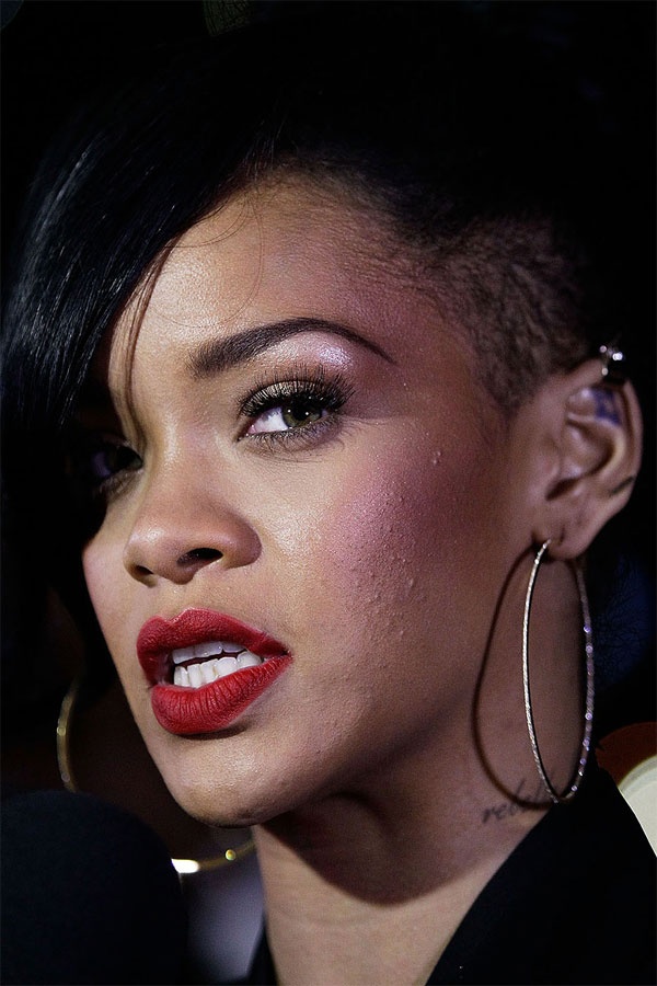 | Dù trang điểm khá kĩ càng nhưng Rihanna cũng không thể che dấu làn da xấu xí. |