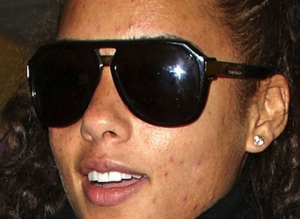 | Làn da Alicia Keys mọc mụn kín bưng. |