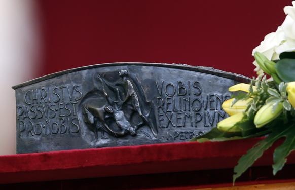 | 9 mảnh xương của Thánh Peter nằm trong một hộp nhỏ và chiếc hộp ấy nằm trong một rương bằng đồng. Giáo hoàng Francis cầu nguyện trước rương trước khi ngài cử hành thánh lễ Misa. Ảnh: AP. |