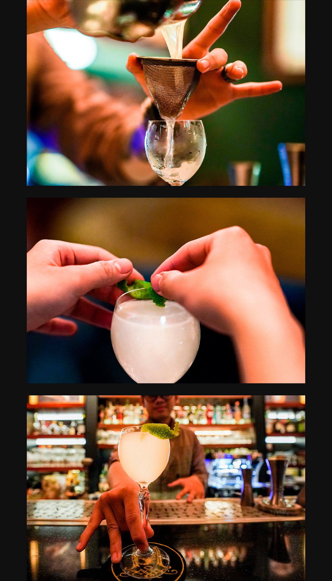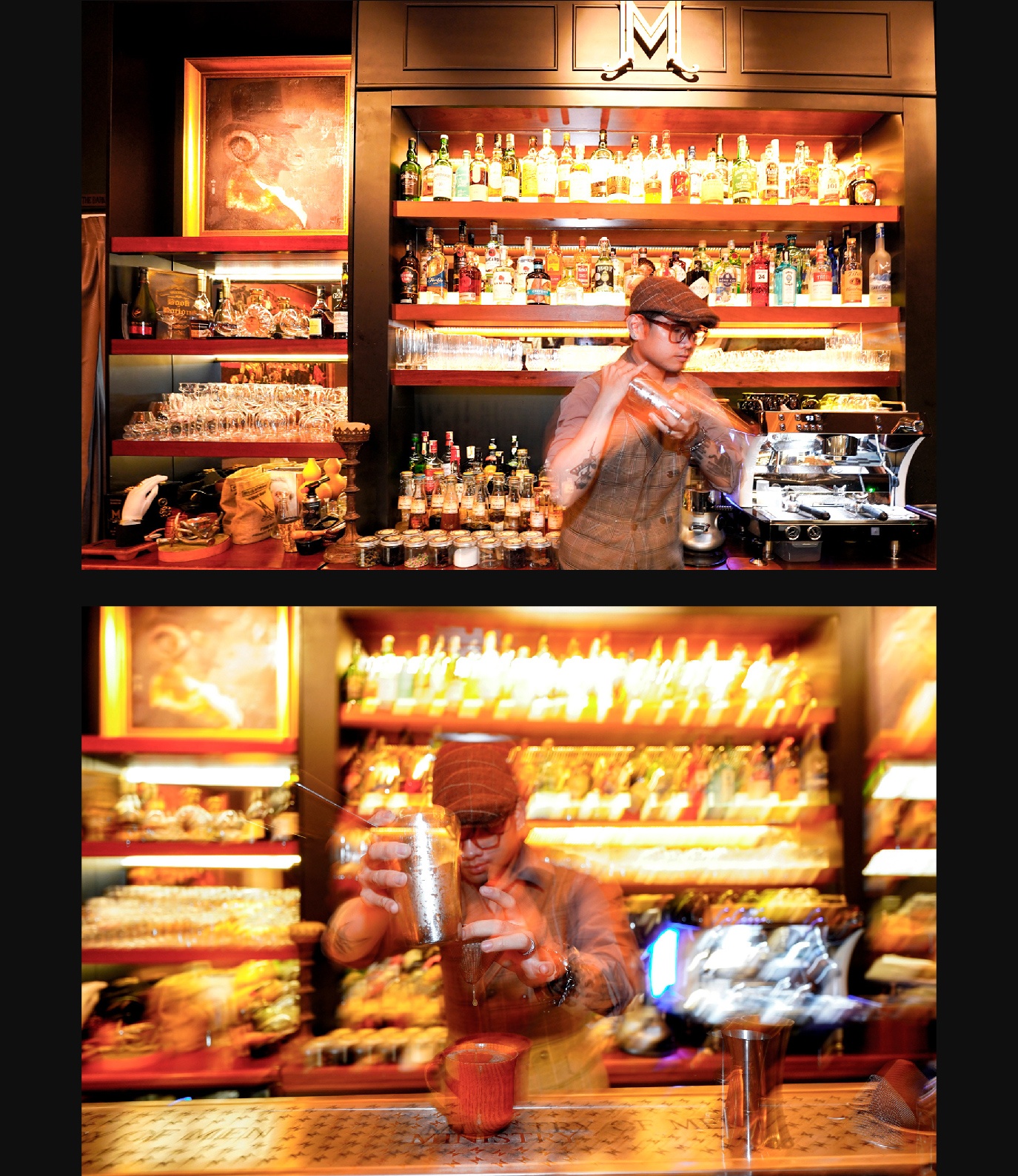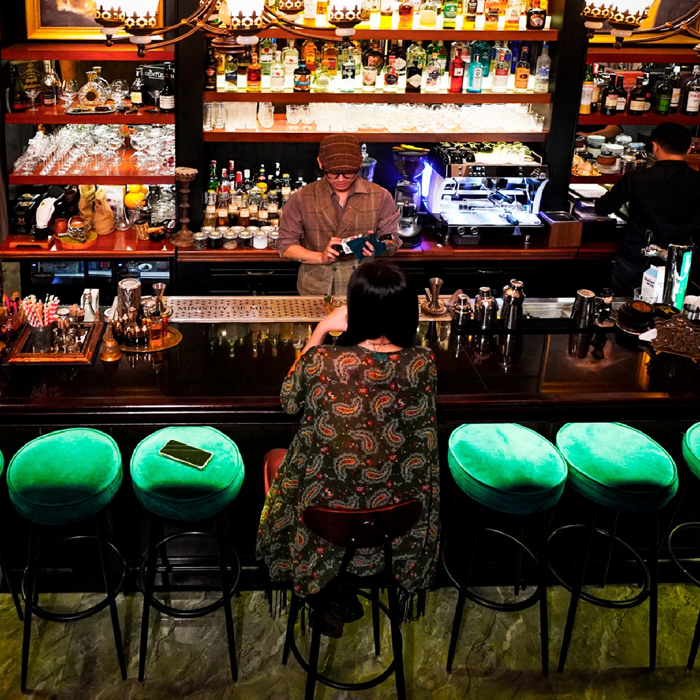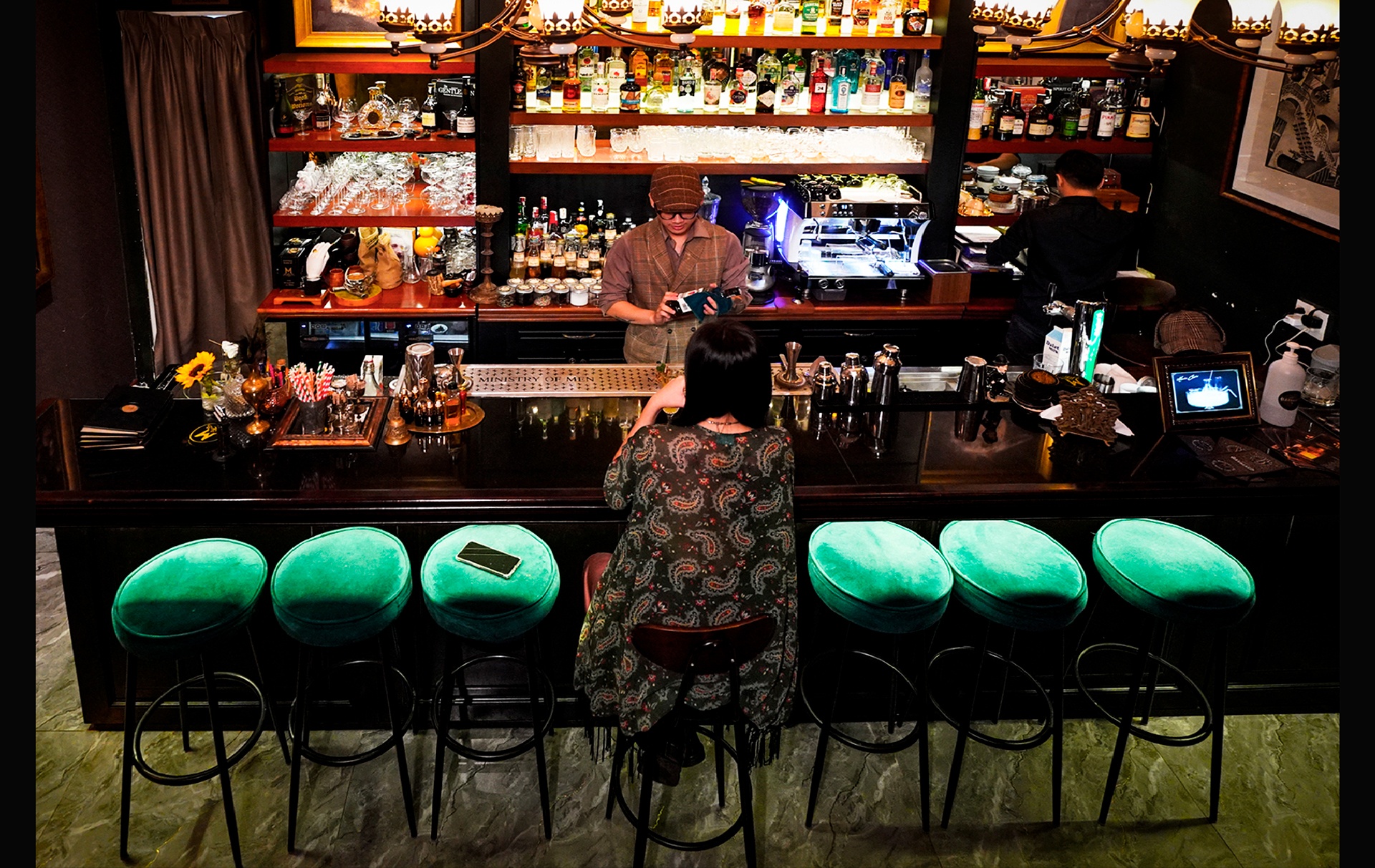 Thông thường, nếu đi thành nhóm đông hay từng cặp, khách hàng có thể ngồi ở dãy bàn cao hay sô pha lớn phía ngoài. Do chỉ có một mình, tôi chọn vị trí ngồi ở khúc giữa quầy bar nhằm dễ dàng theo dõi các bartender làm việc và tham gia vào cuộc vui cùng những vị khách khác.