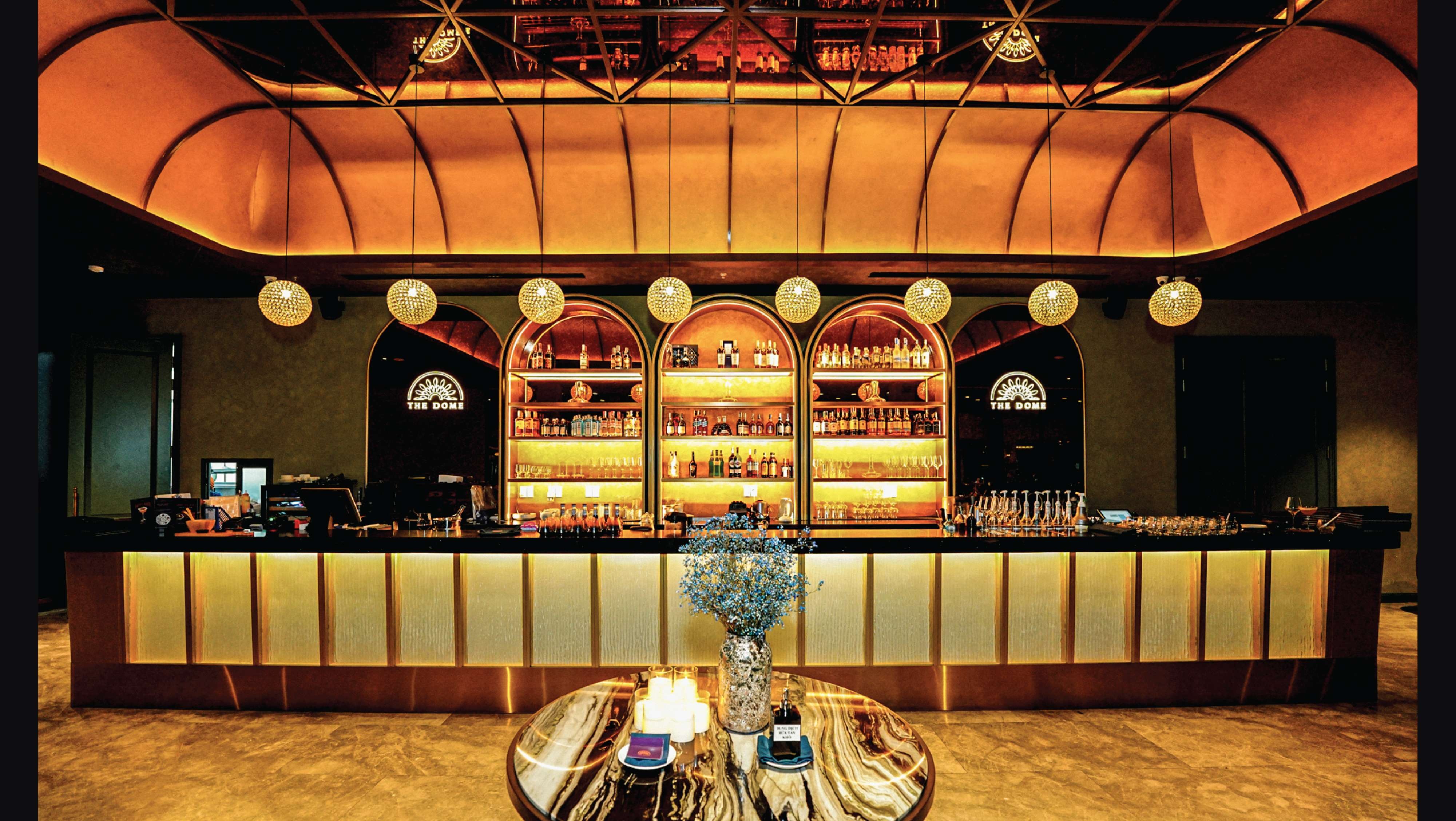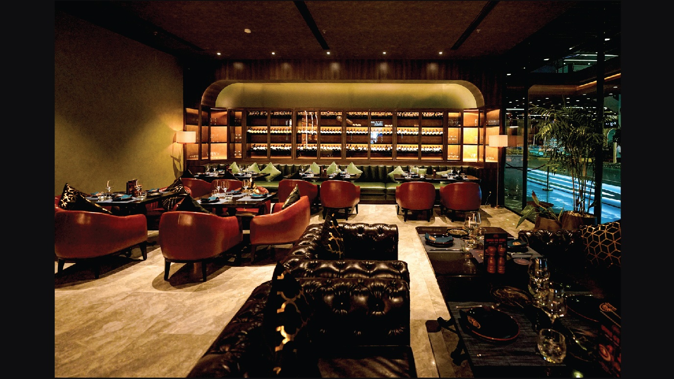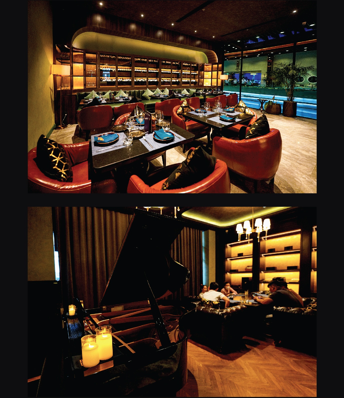 Nhà hàng này mang hơi hướm cổ điển xem lẫn hiện đại, với những chiếc đèn chùm pha lê rực rỡ, hàng ghế bành được xếp thẳng thớm bên cạnh dãy bàn đá dài.