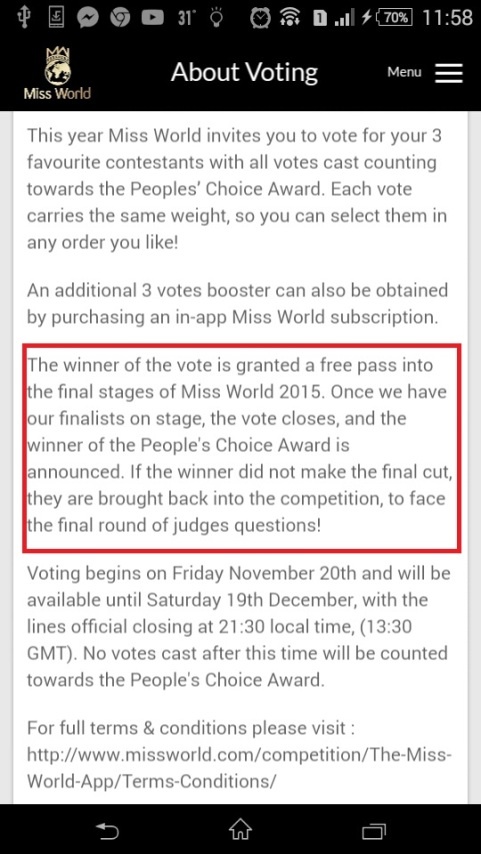 Theo thông báo từ website chính thức của cuộc thi HHTG năm nay thì phần bình chọn cho thí sinh yêu thích nhất phải thông qua phần ứng dụng di động.