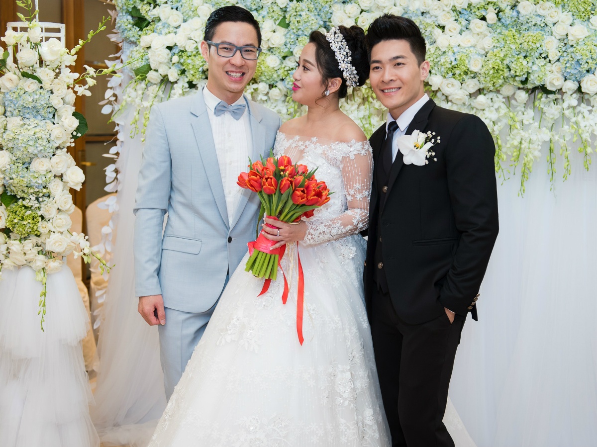 MC Anh Quân vốn là bạn bè thân thiết của cô dâu nên không thể vắng mặt. Đồng thời, anh cũng là người dẫn dắt tiệc cưới của cô bạn thân. |