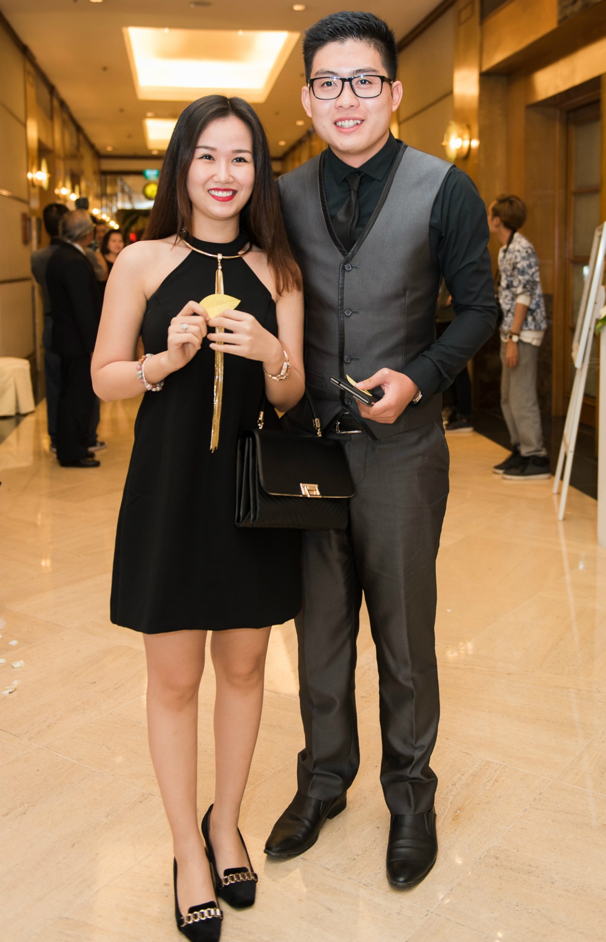 Ca sĩ Võ Hạ Trâm và bạn trai ton sur ton khi dự tiệc cưới. Trong khoảng thời gian cô thi Tiếng hát truyền hình, Hạ Trâm có dịp làm quen với cô dâu. |