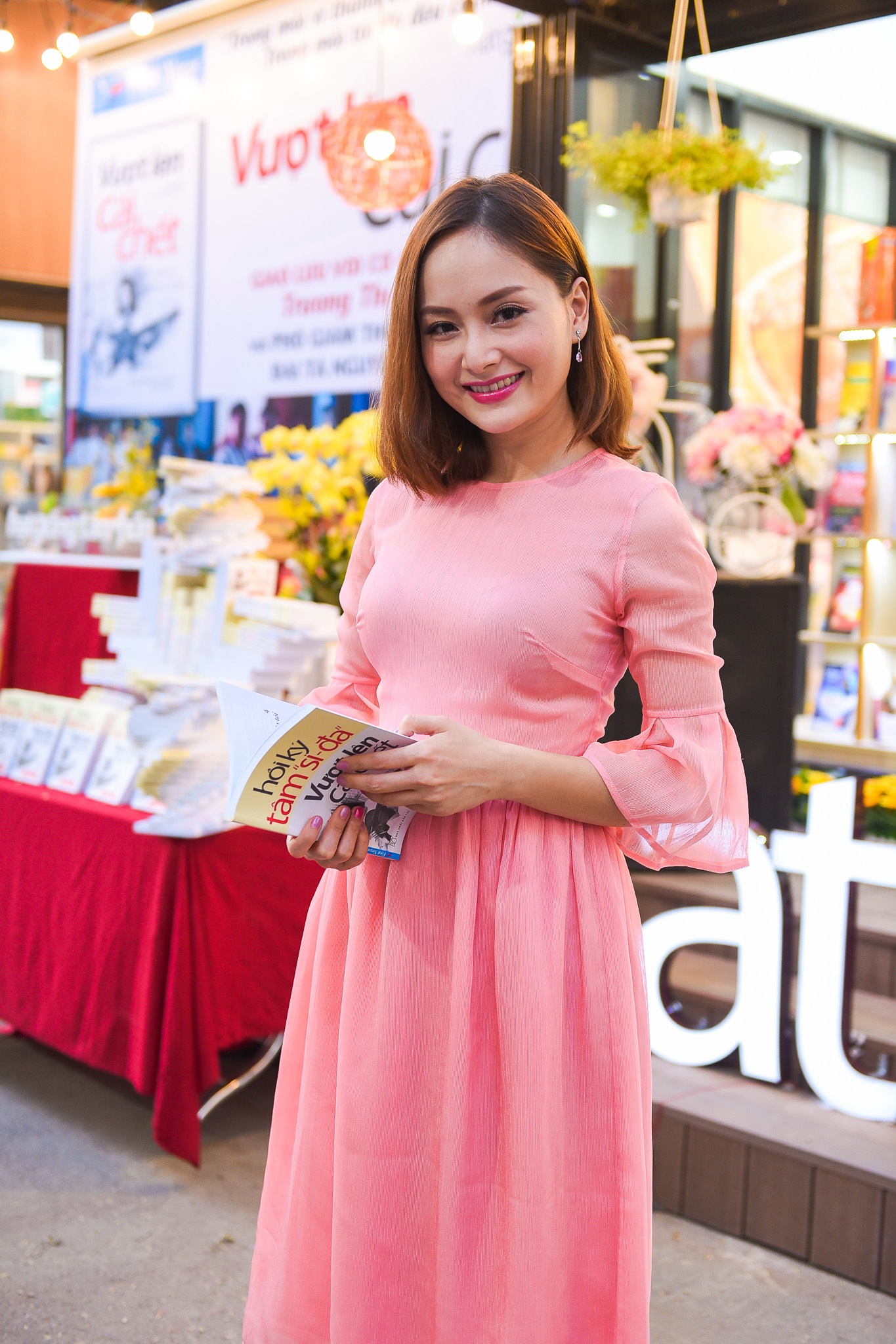 Mai Lan của phim "Cô gái xấu xí" diện đầm hồng ngọt ngào đến tham gia buổi giao lưu với tác giả cuốn sách Hồi ký Tâm siđa - Vượt lên cái chết vào chiều 30/1 tại đường sách TP HCM.