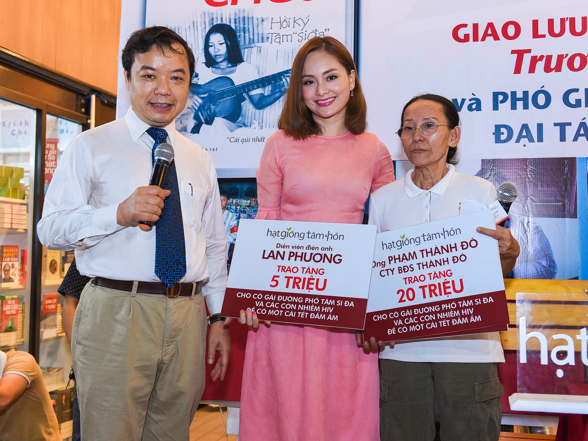 | Tại buổi giao lưu, các mạnh thường quân đã gửi tặng tiền giúp đỡ chị Hồng Tâm, trong đó, diễn viên Lan Phương tặng chị 5 triệu đồng. Ngoài ra, chị Hồng Tâm