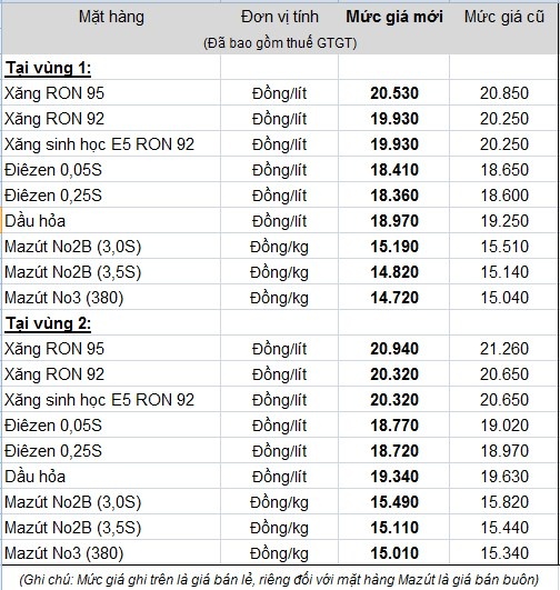 Sau khi giảm, giá xăng dầu bán lẻ ra thị trường lần lượt như sau: xăng RON 92 giá 19.930 đồng/lít, dầu diesel giá 18.410 đồng/lít, dầu hỏa giá 18.970 đồng/lít.