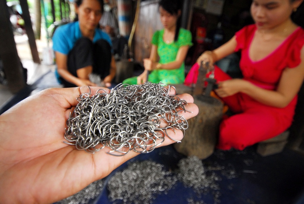 | Làng sản xuất lưỡi câu Mỹ Hòa có trên 100 hộ với khoảng 600 lao động đang bước vào mùa vụ chính trong năm. Mỗi ngày, nơi đây sản xuất hàng tấn lưỡi câu xuất bán cho thị trường. |