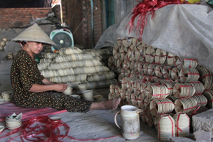 | Chuyển từ sản xuất truyền thống sang hiện đại, thợ gốm ở đây đều có thâm niên trong nghề từ 10 - hơn 30 năm, hằng ngày mỗi thợ làm ra từ 100 - 200 sản phẩm gốm xuất khẩu. |