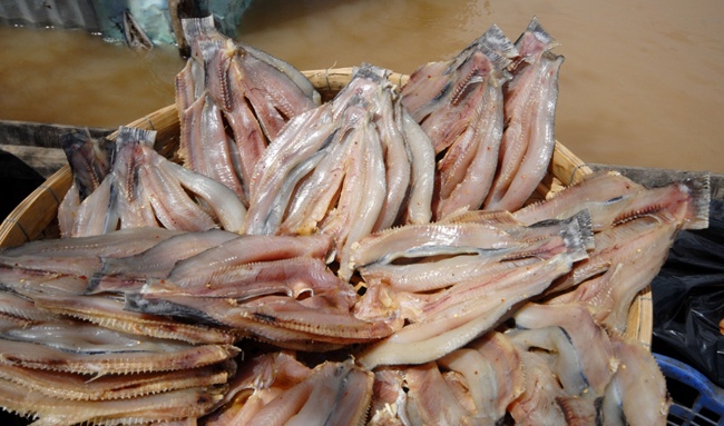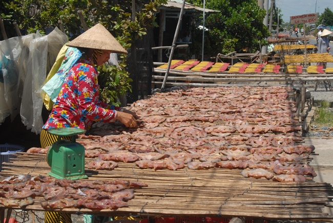 Cùng với cá sặc, cá lóc được phơi một nắng cũng là mặt hàng khô có tiếng làng Khánh An sản xuất mạnh trong mùa lũ.