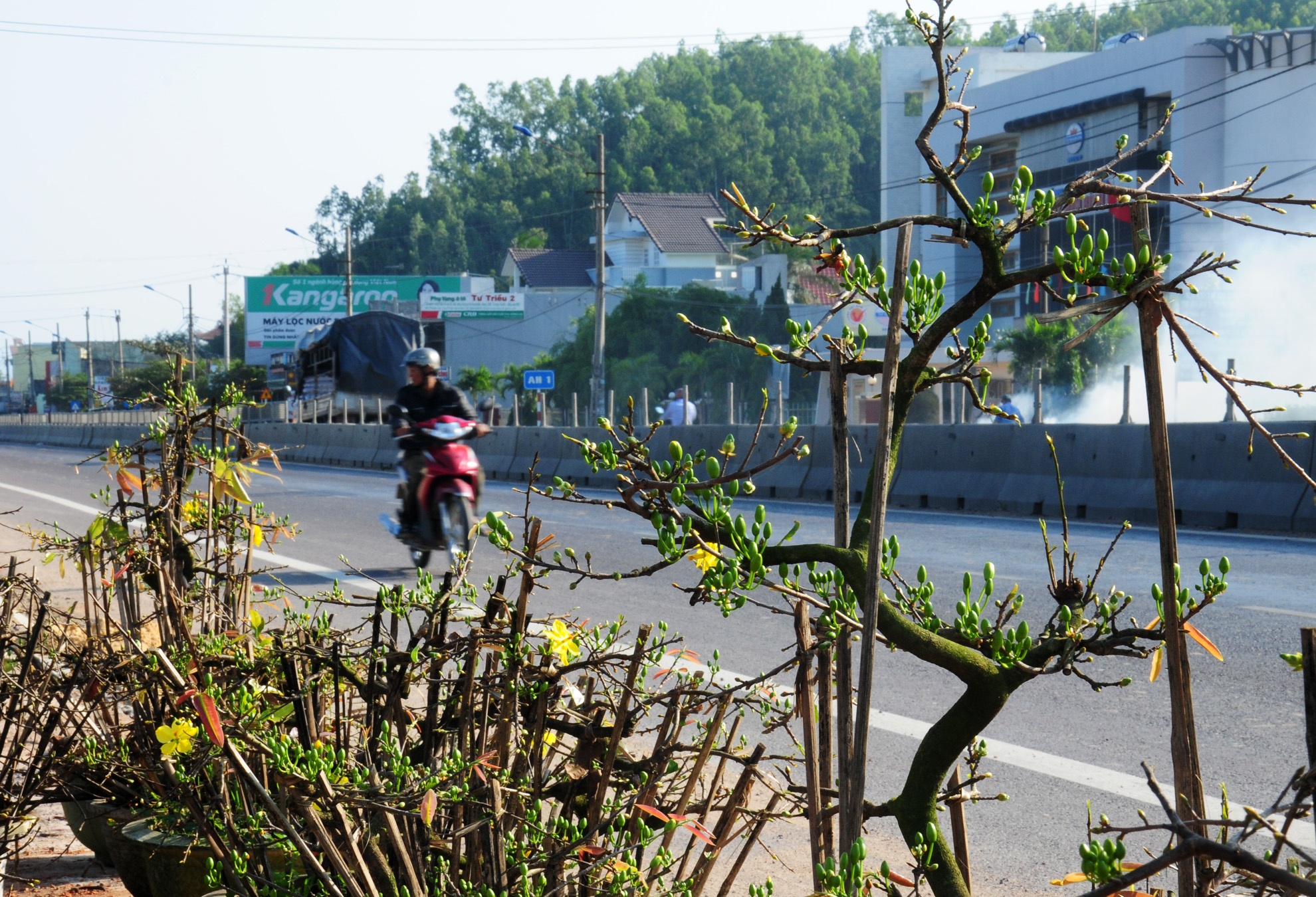 | Nhiều hộ vận chuyển hoa mai từ vườn lên ven quốc lộ 1 để dễ bán cho thương lái, hy vọng vớt vát trước Tết. Ảnh: Minh Hoàng. |