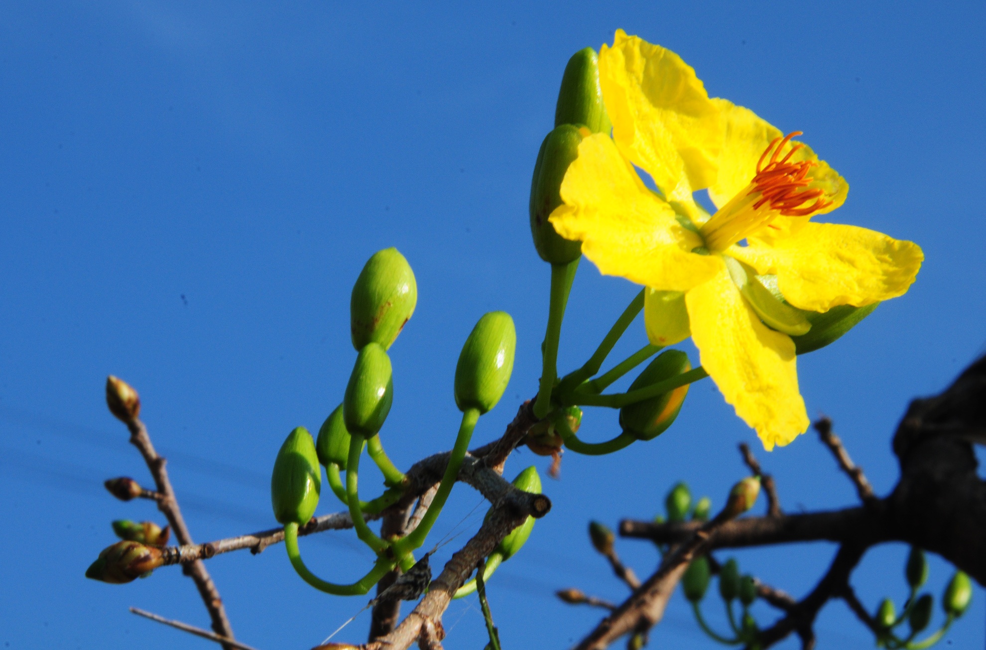 | Nắng nóng kéo dài, hoa mai bung nở sớm trước Tết ở làng mai Nhơn An. Ảnh: Minh Hoàng. |
