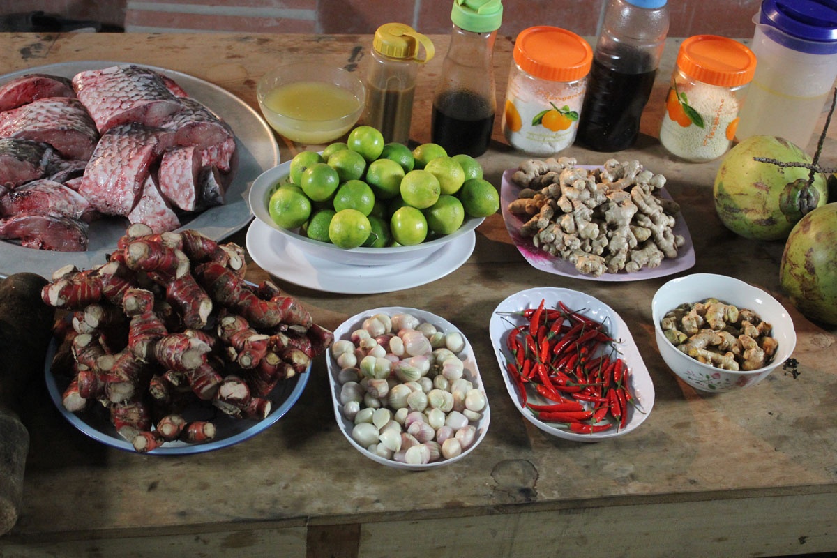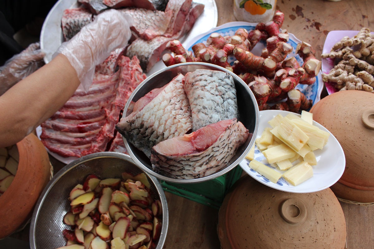 Gia vị kho cá gồm riềng, sườn lợn, kẹo đắng, ớt, nước cốt chanh… đều là "cây nhà lá vườn" của các khu vực quanh làng.