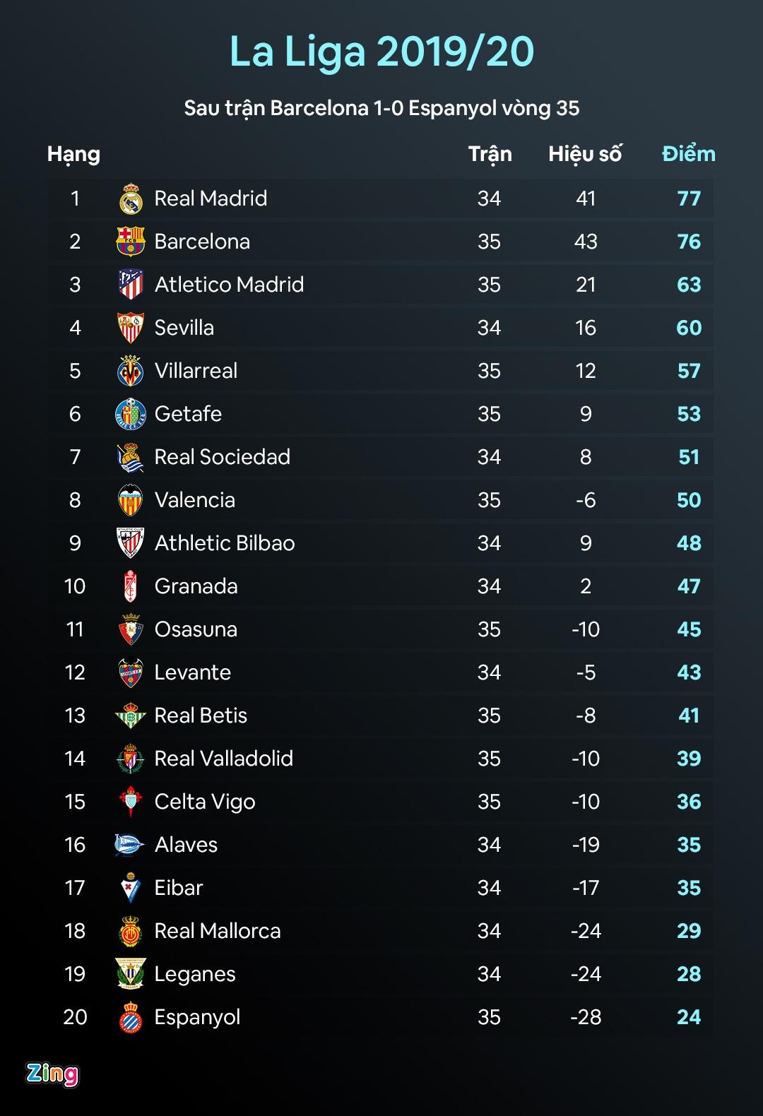 Rạng sáng 9/7 (giờ Hà Nội), Barca đối đầu Espanyol tại vòng 35 La Liga 2019/20. Messi đá chính, và Barca có chiến thắng 1-0 nhờ pha lập công của Luis Suarez.