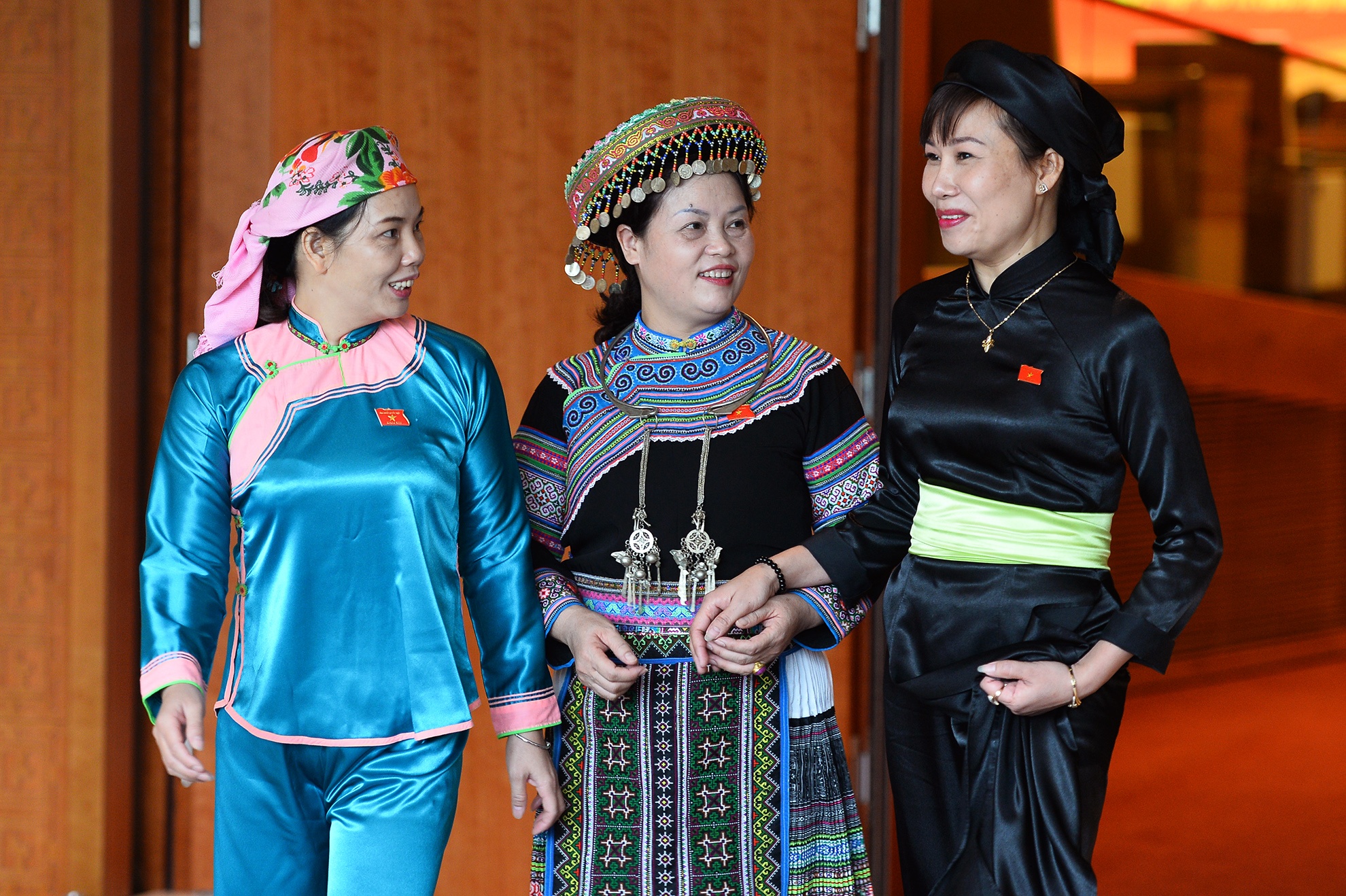 | Trong ngày khai mạc, các nữ đại biểu mặc trang phục của dân tộc mình. |