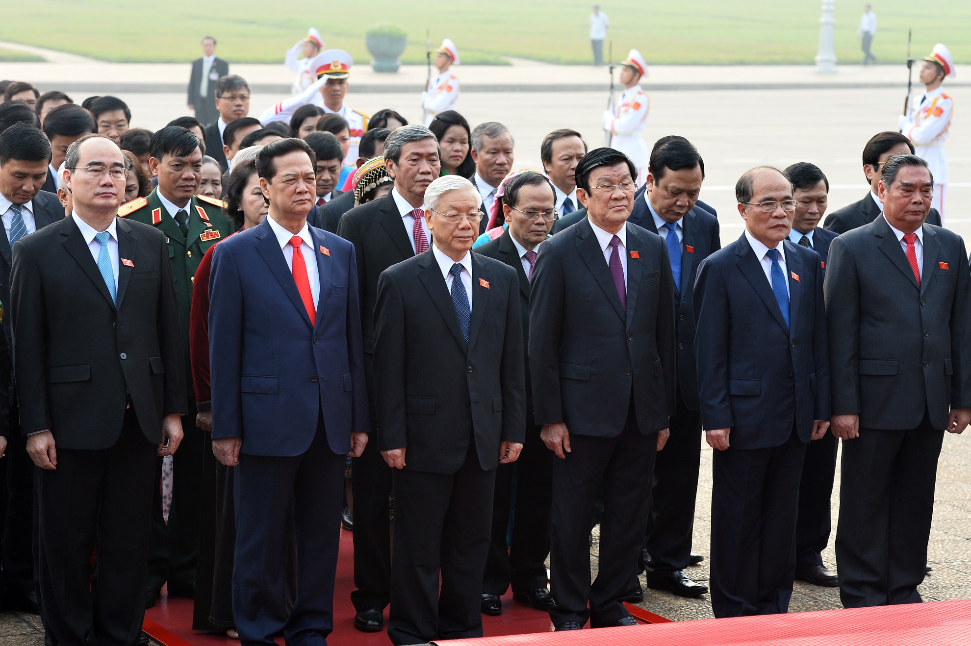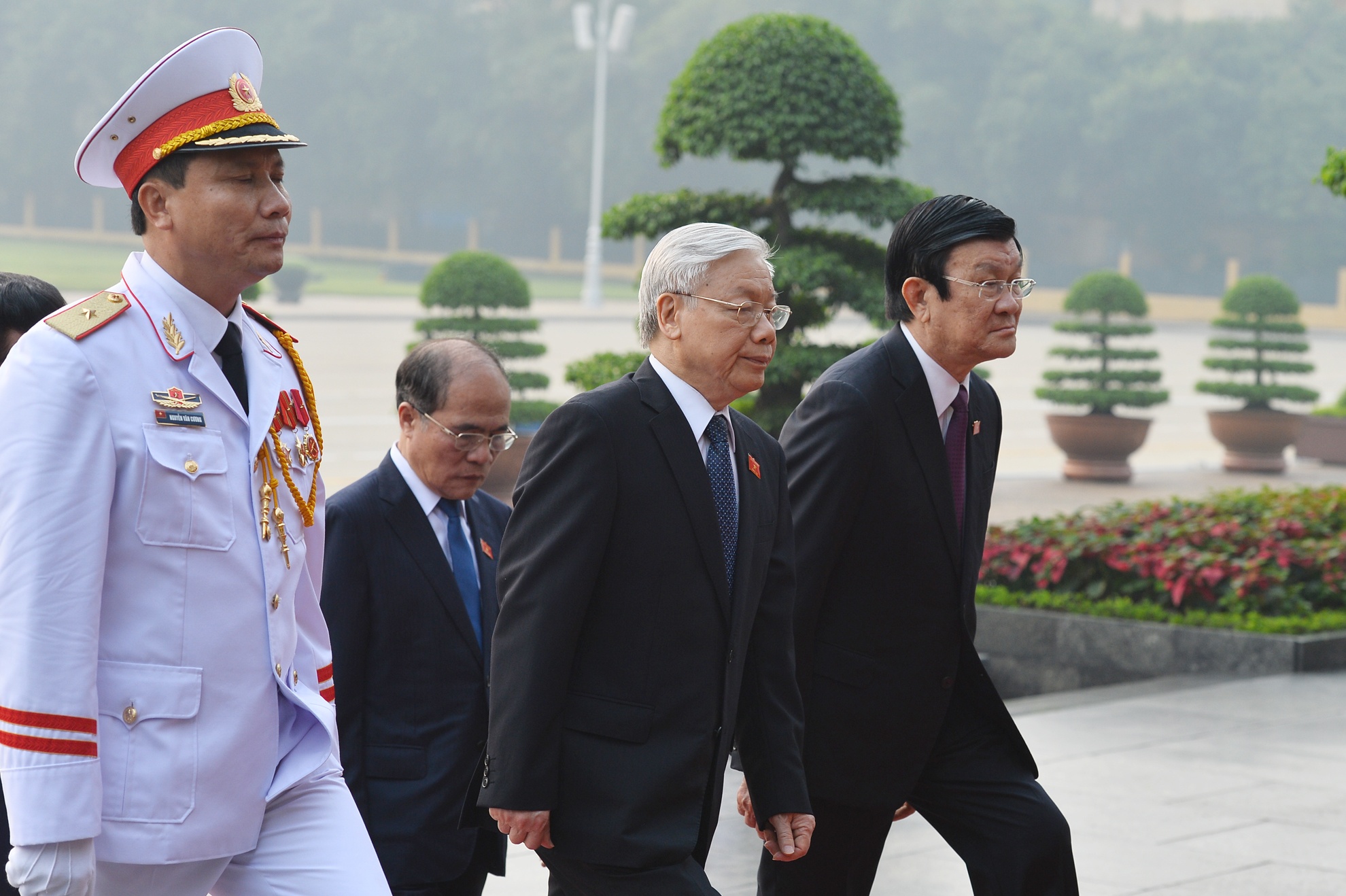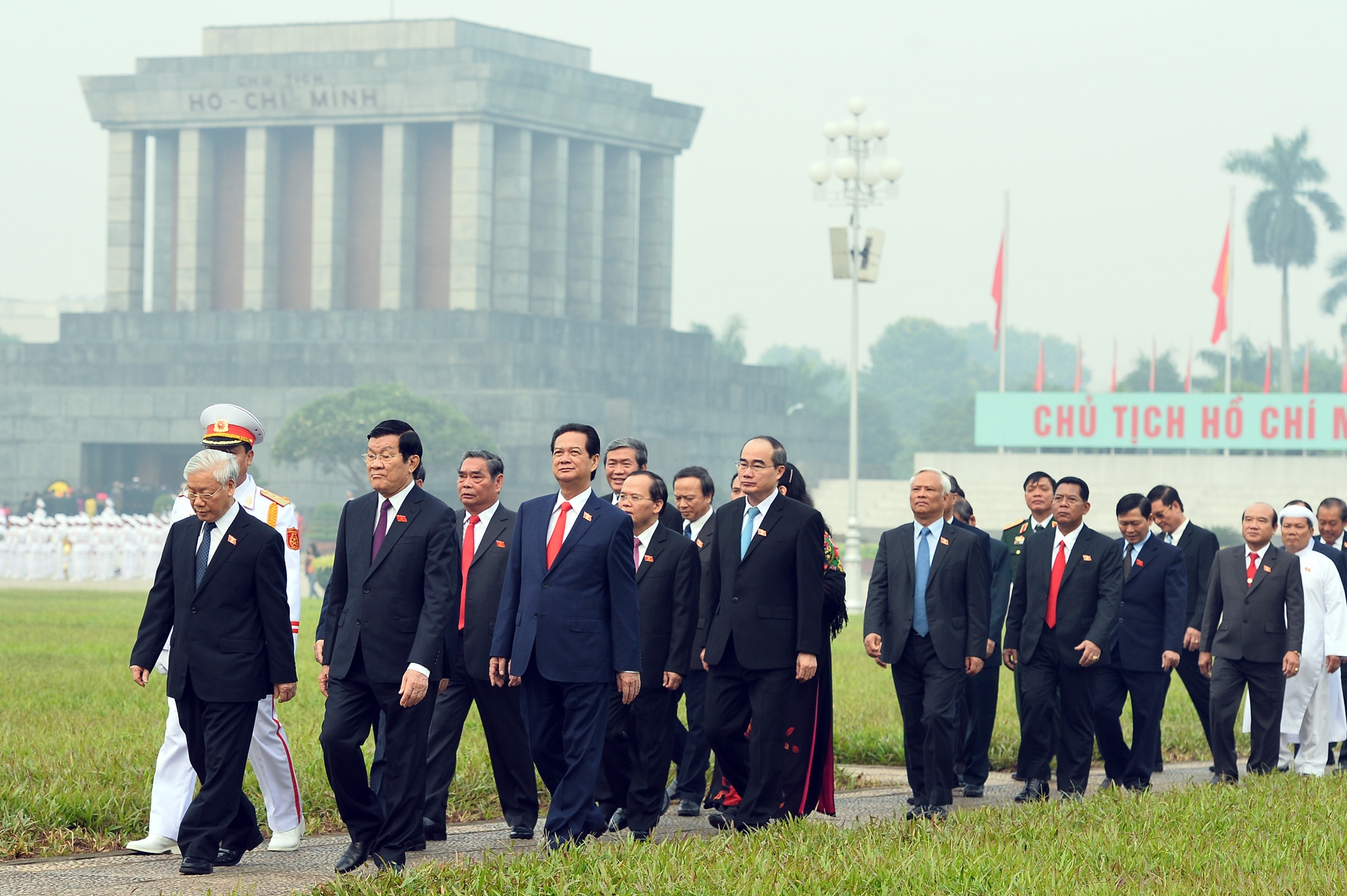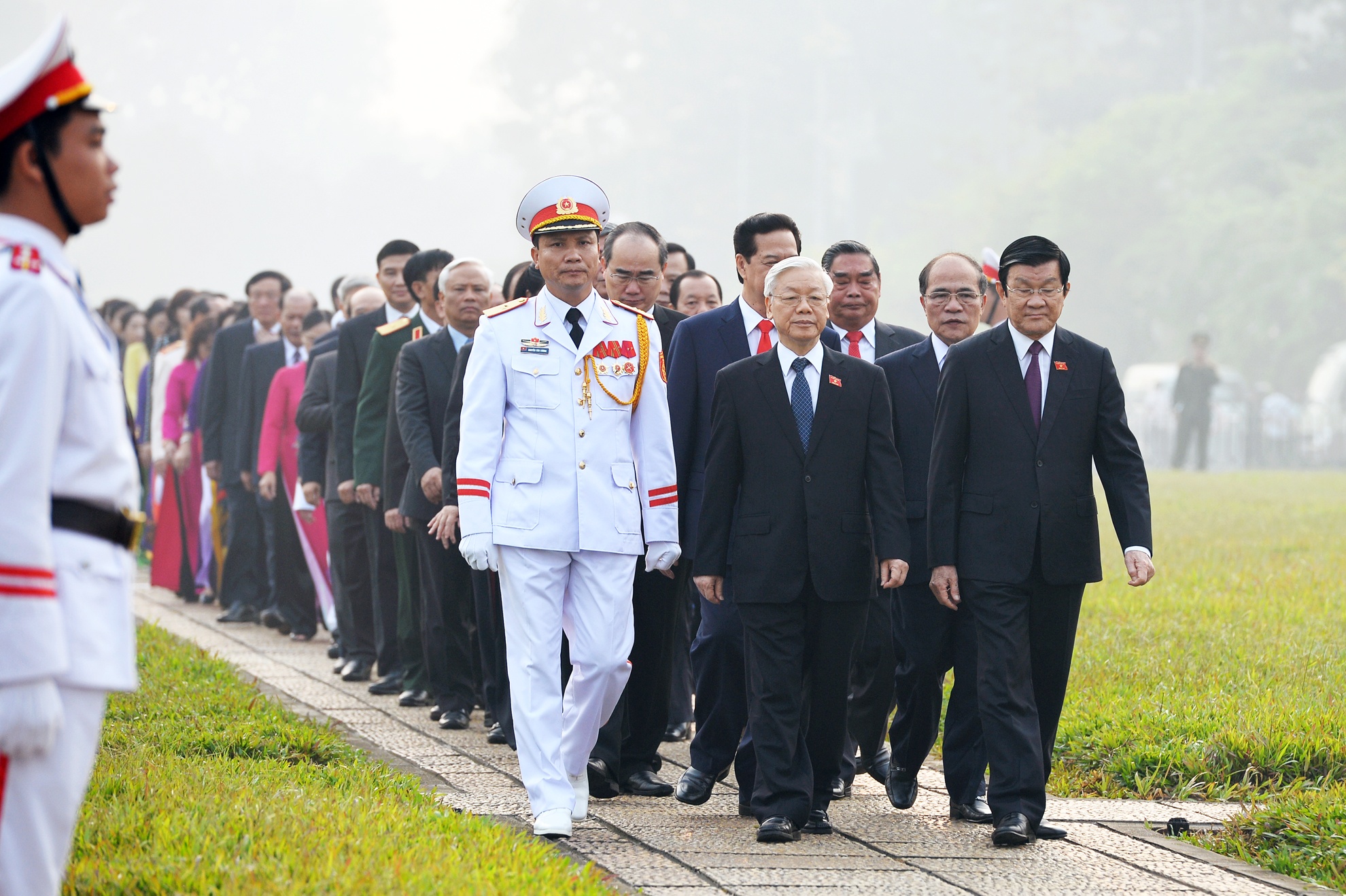 | Đoàn đại biểu do Tổng bí thư Nguyễn Phú Trọng, Chủ tịch nước Trương Tấn Sang, Chủ tịch Quốc hội Nguyễn Sinh Hùng và Thủ tướng Nguyễn Tấn Dũng dẫn đầu đi từ phía Toà nhà Quốc hội tiến vào lăng. |
