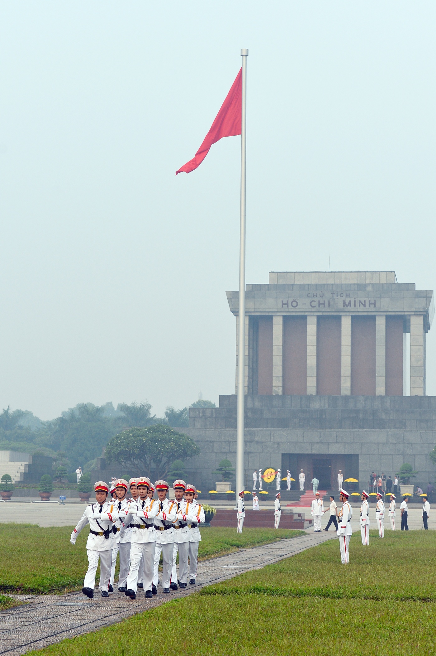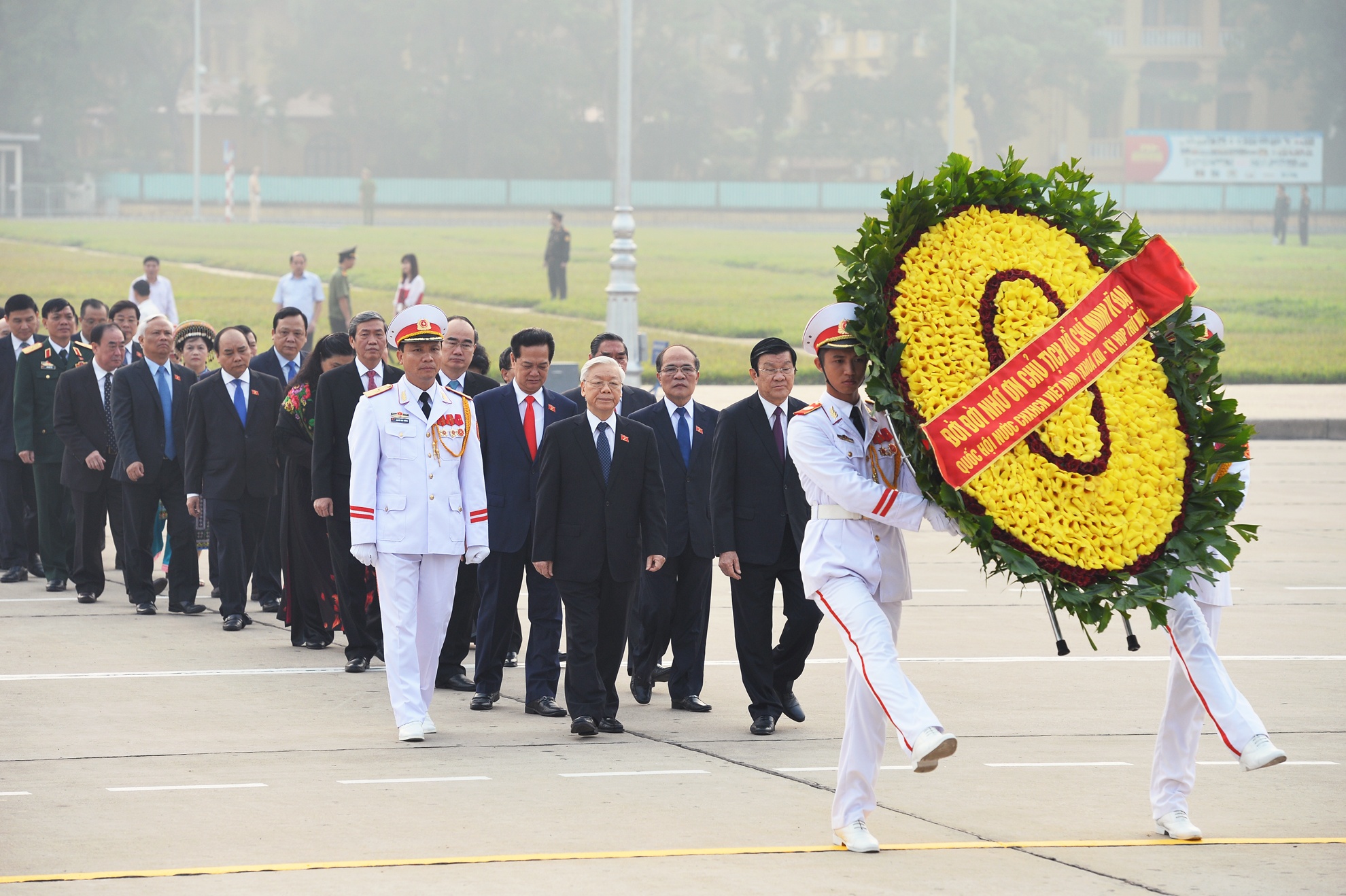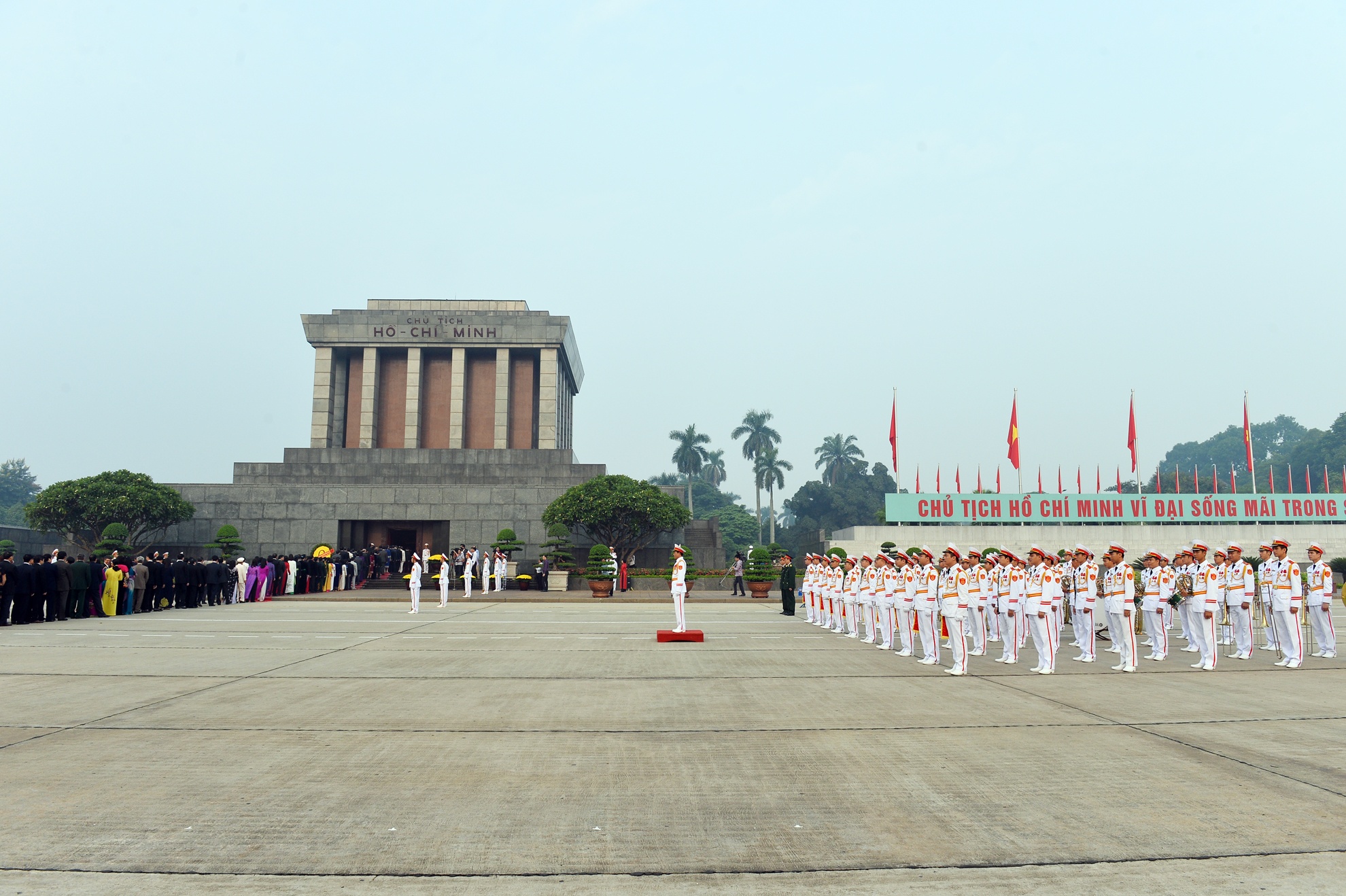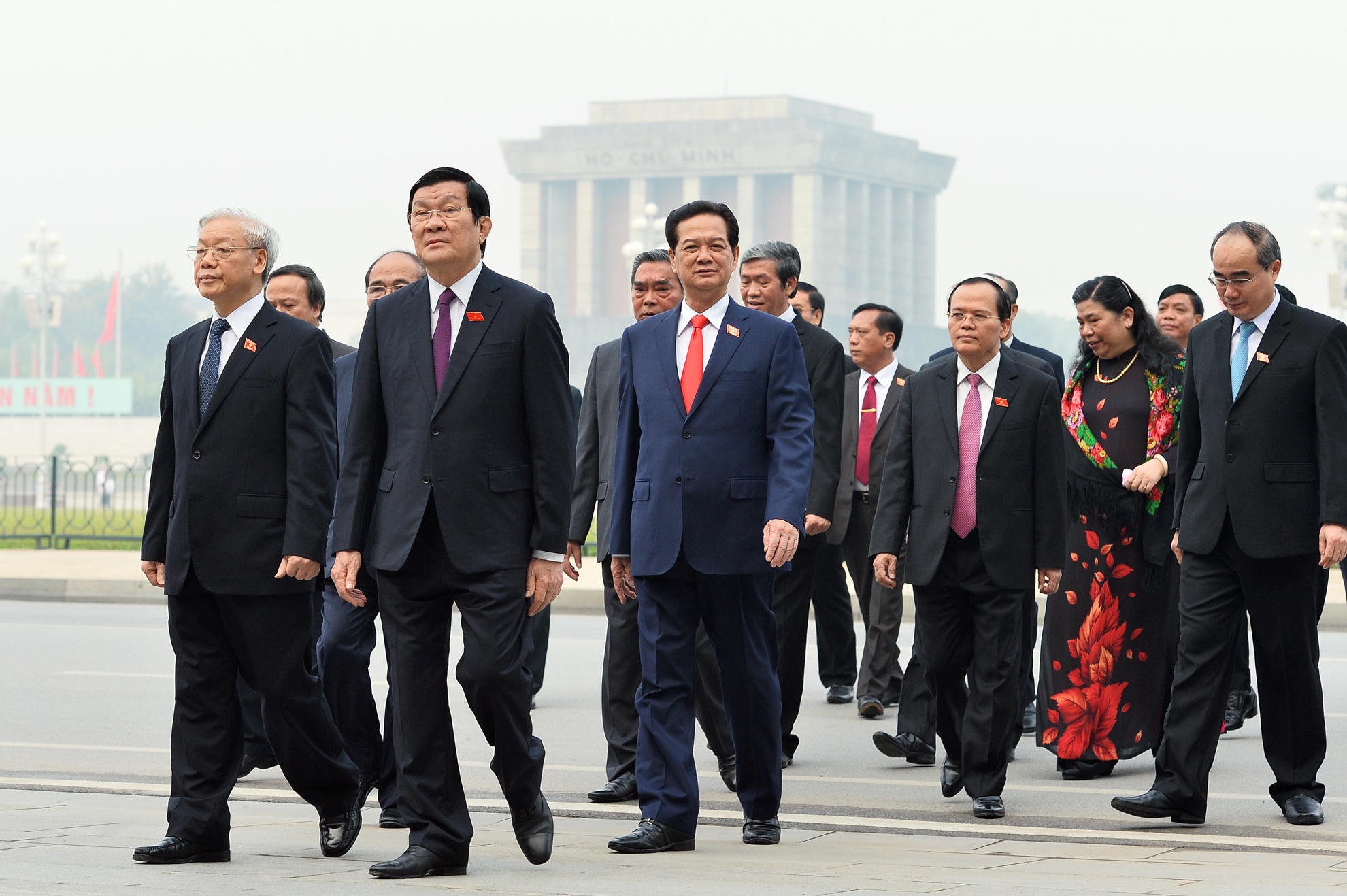 | Đoàn đại biểu do Tổng bí thư Nguyễn Phú Trọng, Chủ tịch nước Trương Tấn Sang, Chủ tịch Quốc hội Nguyễn Sinh Hùng và Thủ tướng Nguyễn Tấn Dũng dẫn đầu đi từ phía Toà nhà Quốc hội tiến vào lăng. |