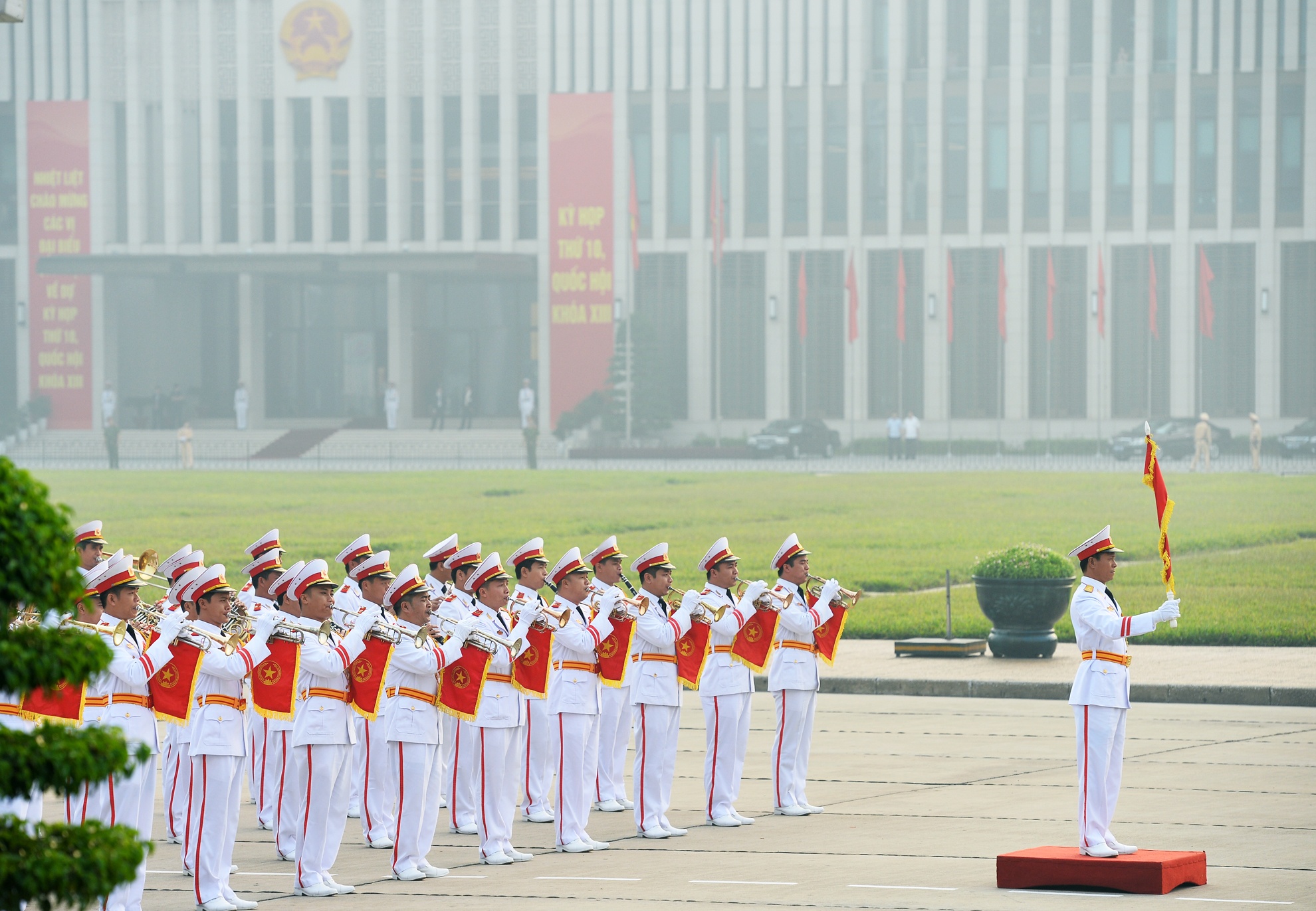| Trước đó, từ 6h30, đội quân nhạc có mặt chuẩn bị cho nghi thức đón đoàn đại biểu Quốc hội tại Quảng trường Ba Đình (Hà Nội). |