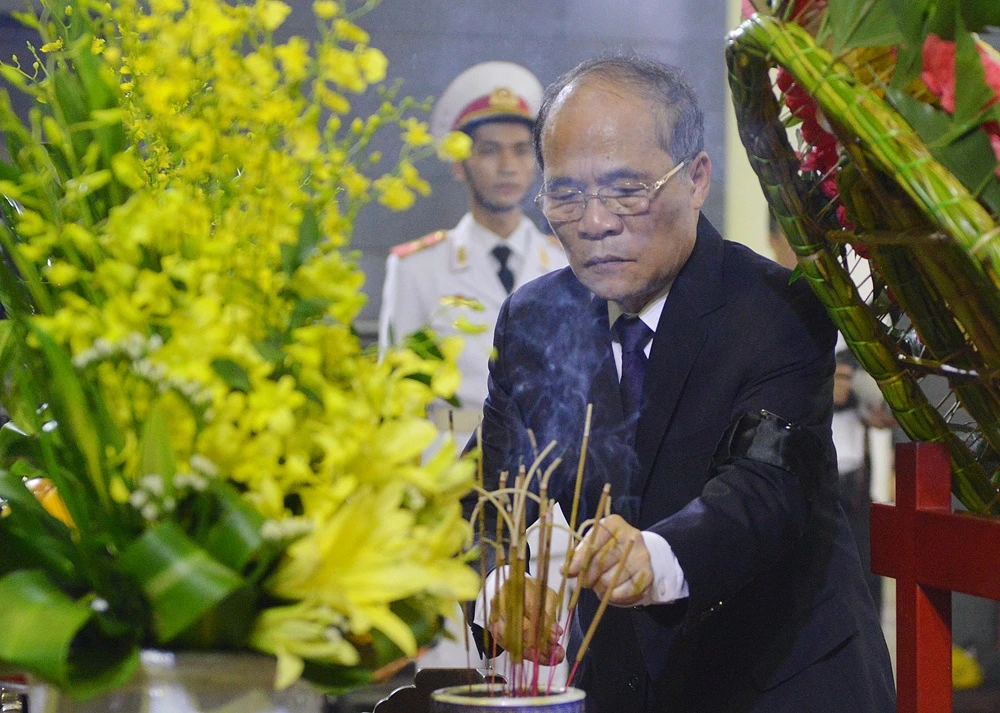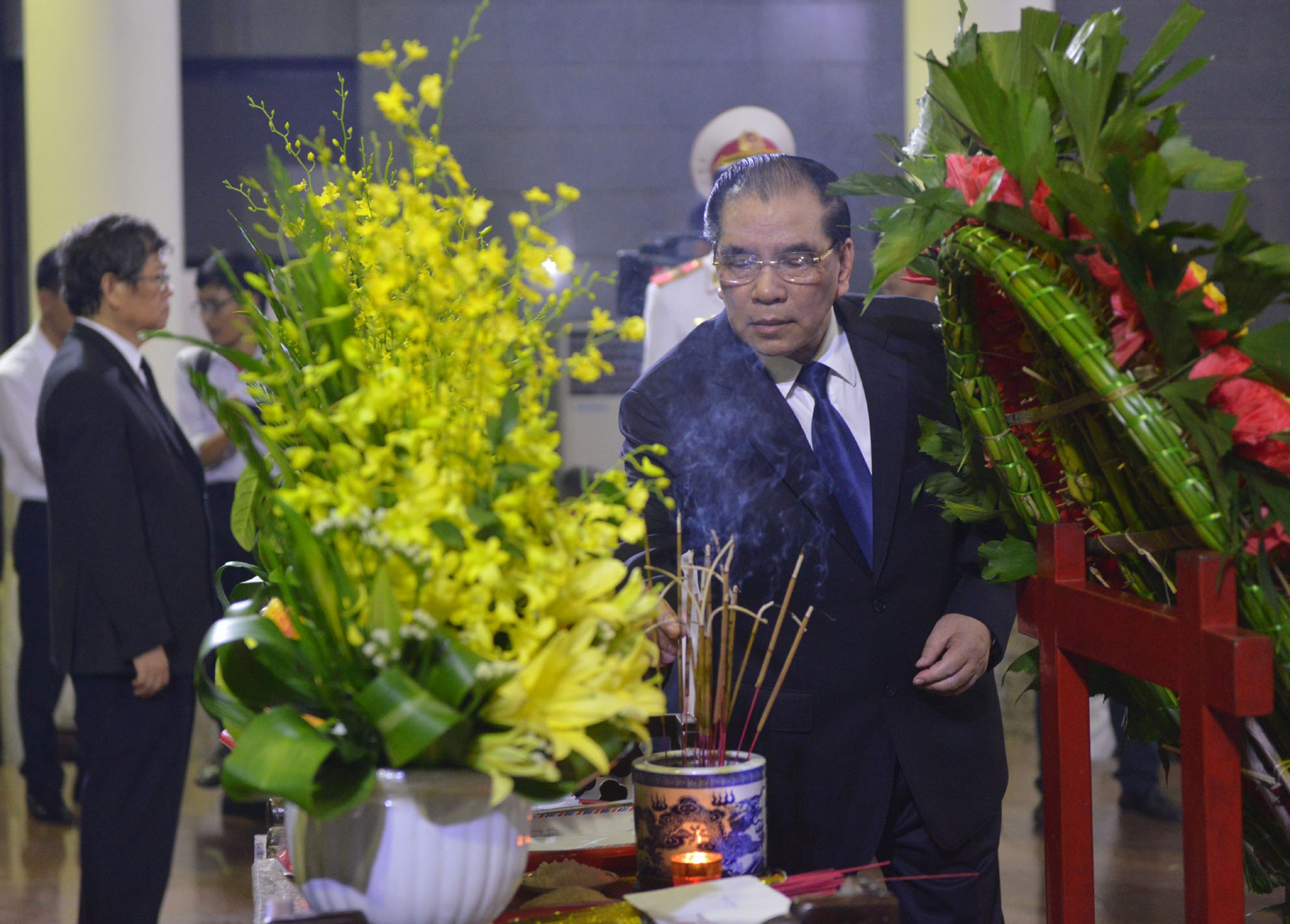 | Chủ tịch Quốc hội Nguyễn Sinh Hùng thắp hương và nhìn mặt nguyên Tổng biên tập báo Nhân Dân lần cuối. |
