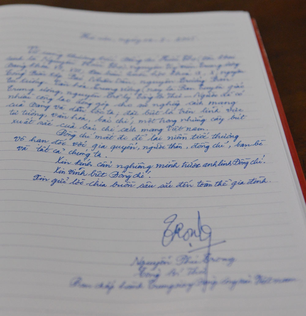 | Chủ tịch nước cùng nhiều vị lãnh đạo cũng gửi lời tiễn biệt trong cuốn sổ tang. |