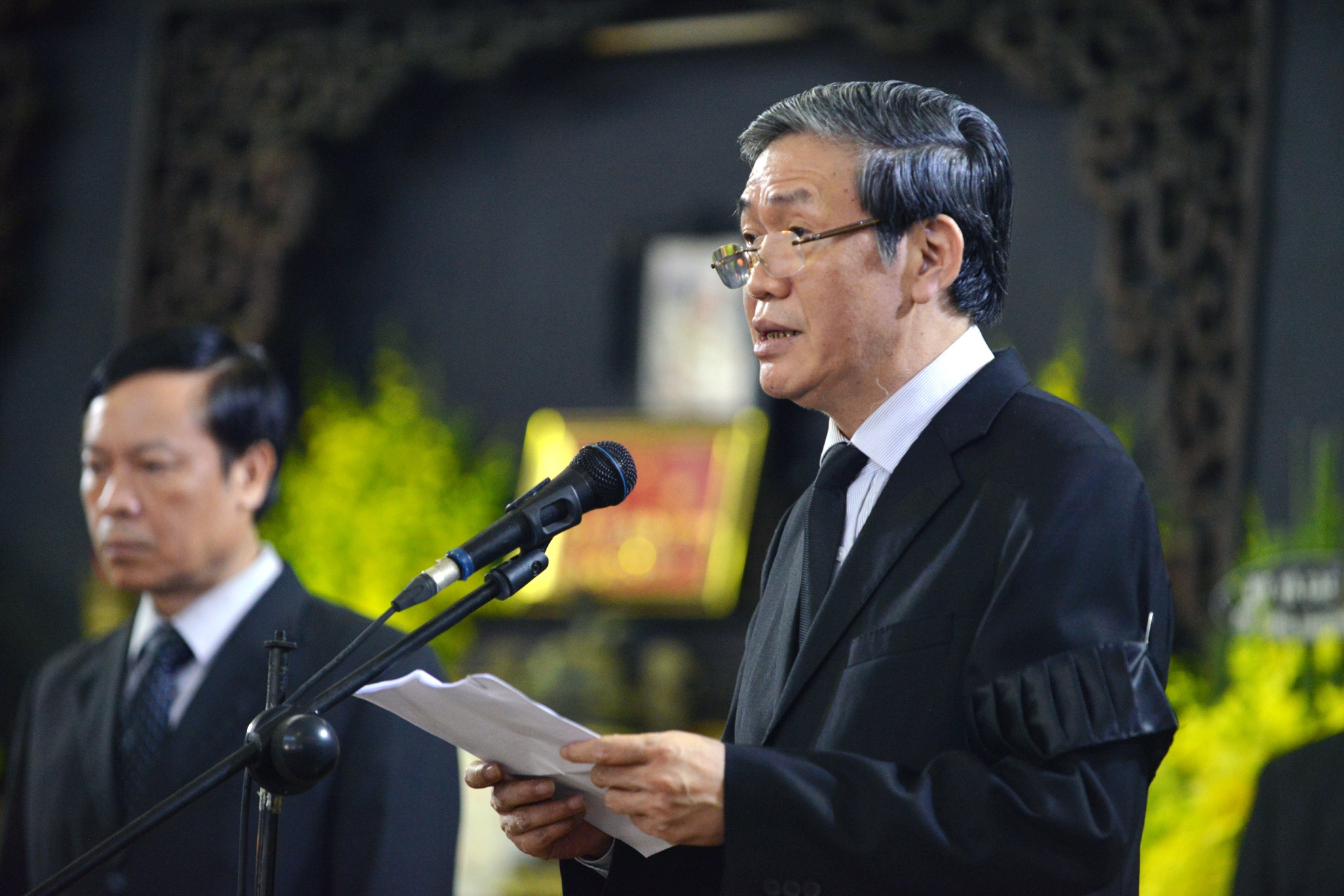 Ông Đinh Thế Huynh và nhà báo Thuận Hữu (Chủ tịch Hội nhà báo Việt Nam) đưa linh cữu ra xe tang.