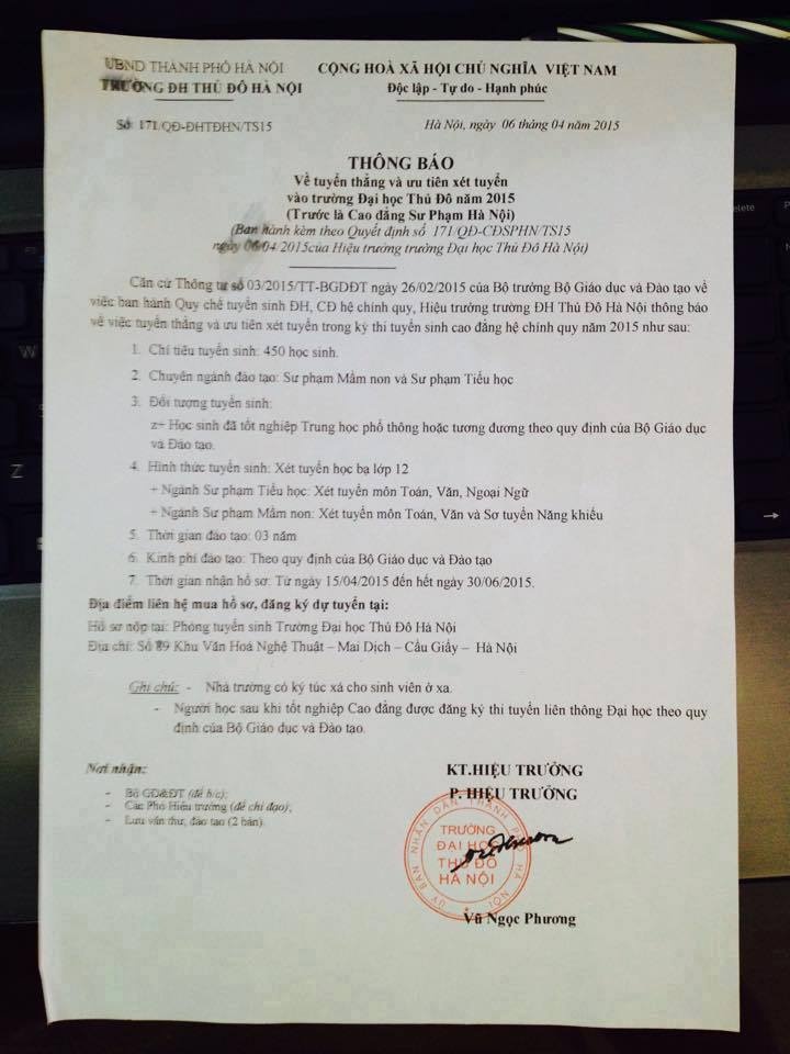 Nhóm này đã gửi cho học sinh ảnh chụp công văn ghi rõ "tuyển sinh hệ cao đẳng chính quy năm 2015" với hình thức "xét tuyển học bạ lớp 12", phía dưới có dấu và chữ ký của Phó hiệu trưởng Đại học Thủ đô Vũ Ngọc Phương.
