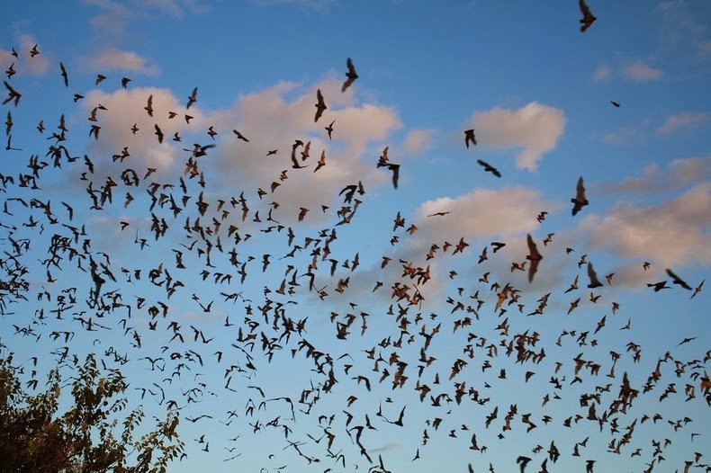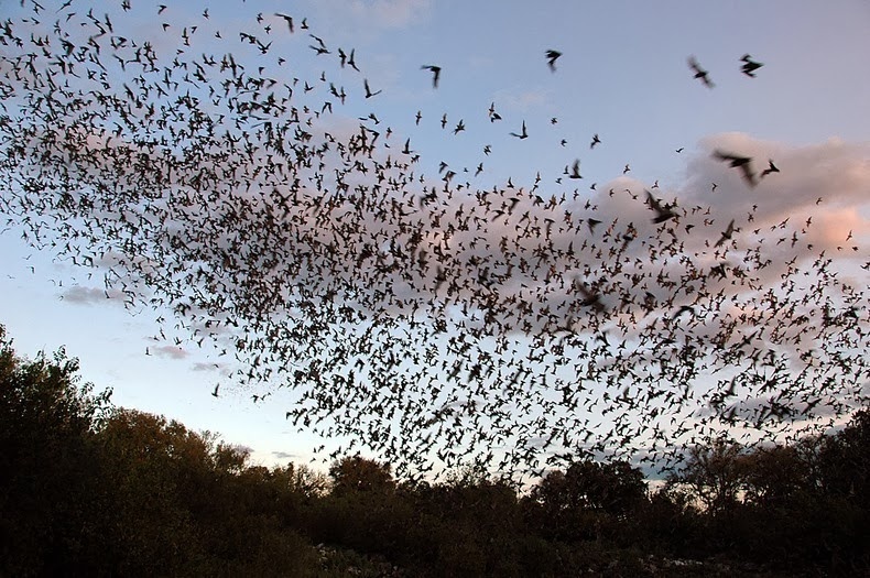 | Dơi trải rộng trên bán kính 97 km, tính từ hang động trở lên thì độ cao mà dơi đang kiếm tìm thức ăn lên đến 3.048 m và trong vòng 8 đến 12 giờ, sau đó chúng chén no nê hàng trăm tấn côn trùng như bướm và các loài sâu gây bệnh cho cây trồng. Sự xuất hiện của dơi quá dày đặc đến nỗi mà hình ảnh của chúng xuất hiện trên radar Doppler. Những người mà có điều kiện nhìn thấy sự xuất hiện của những con dơi hằng đêm đã mô tả âm thanh mà dơi tạo ra như thể những cơn mưa dông liên tục trút xuống. |