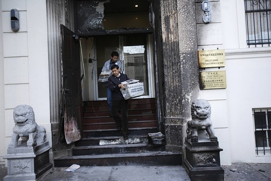 Lãnh sự quán Trung Quốc cho hay, kẻ tấn công đã đậu một chiếc xe tải bên ngoài lãnh sự trước khi phóng hỏa. Tuy nhiên, cơ quan ngoại giao Trung Quốc không cho biết thông tin chi tiết về kẻ tấn công cũng như không đưa ra giả thuyết về động cơ vụ việc. Ảnh: Tân Hoa xã. |