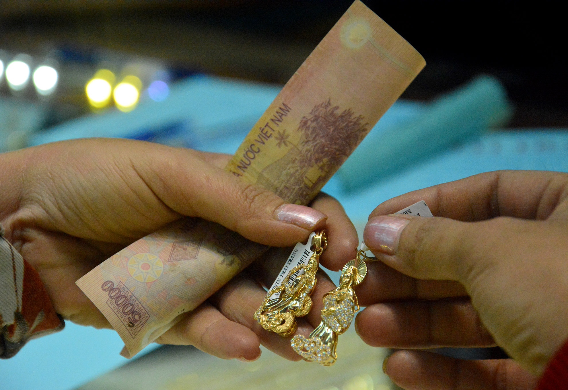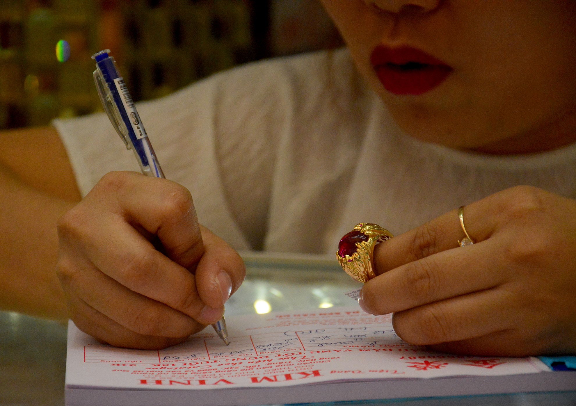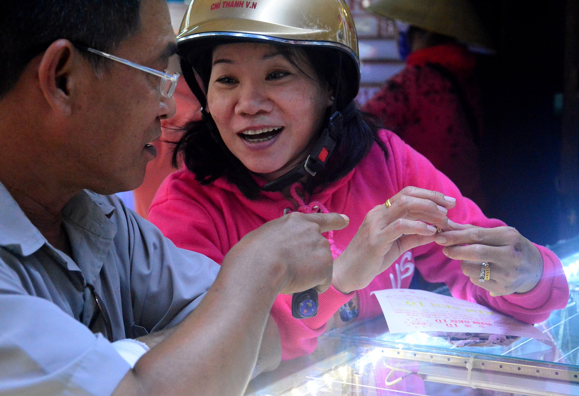 | Nhân viên tiệm vàng Kim Vinh cho biết, cửa hàng bắt đầu đông khách từ ngày mùng 9 tháng Giêng vì nhiều người tranh thủ giá vàng giảm đi mua sớm. Khách mua vàng chủ yếu mong may mắn đầu năm nên không quan tâm loại vàng, tuổi vàng, chủ yếu mua được sản phẩm mình thích. |