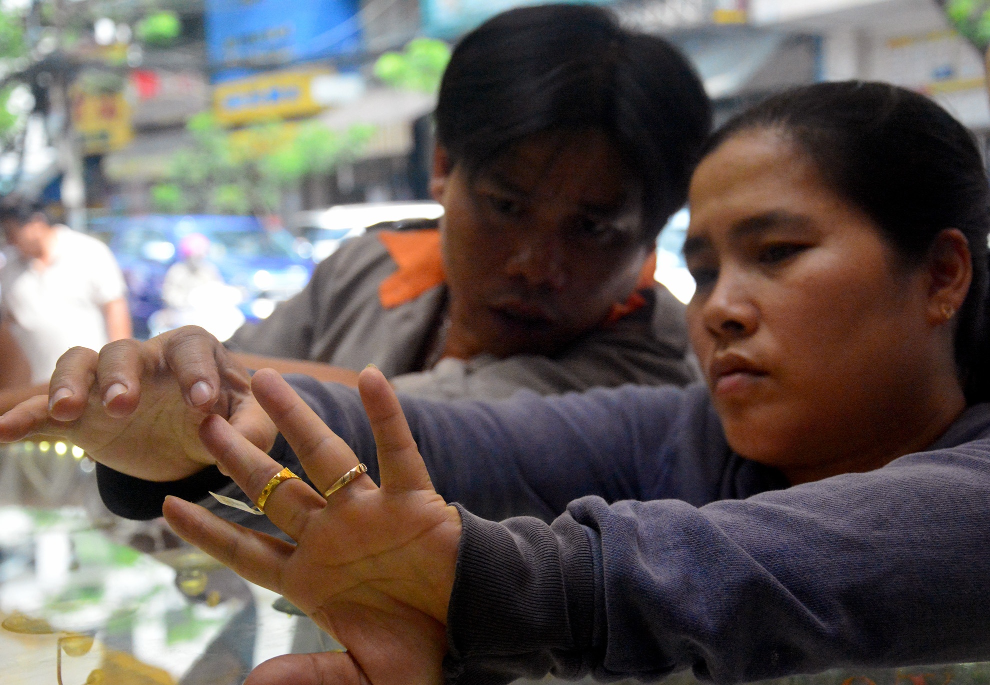| Vợ chồng anh Phương và chị Tuyết (ngụ quận Tân Bình) cẩn thận lựa chon chiếc nhẫn thần tài tại chợ. Anh Phương cho biết, hai vợ chồng buôn bán nhỏ quanh năm, tiết kiệm được chút tiền nên mua 1 chỉ vàng trong ngày vía thần tài để lấy lộc. "Có chút tiền nhỏ mua vàng lấy may đã, khi nào túng thiếu lại bán để tiêu", người đàn ông này nói. |