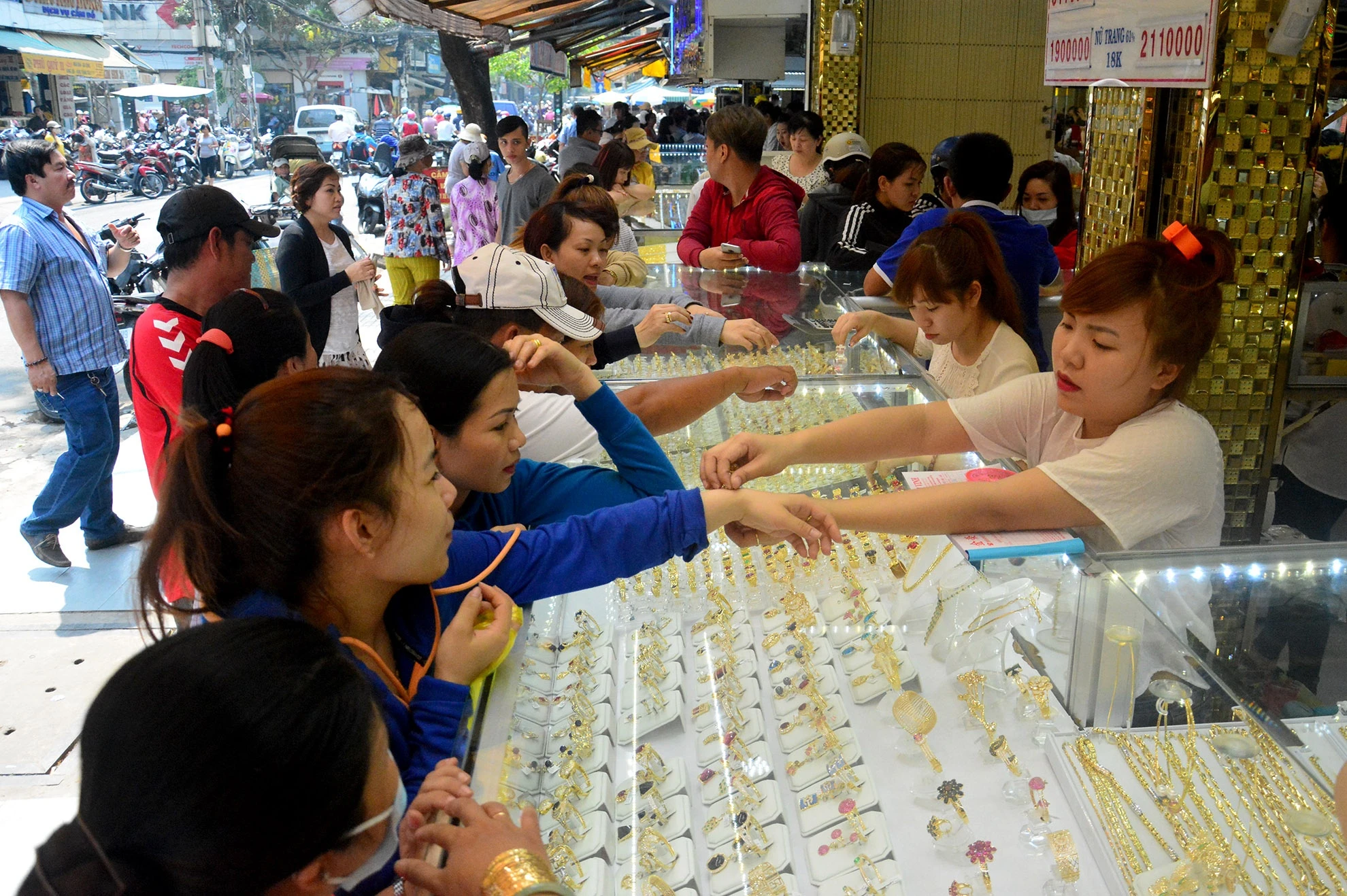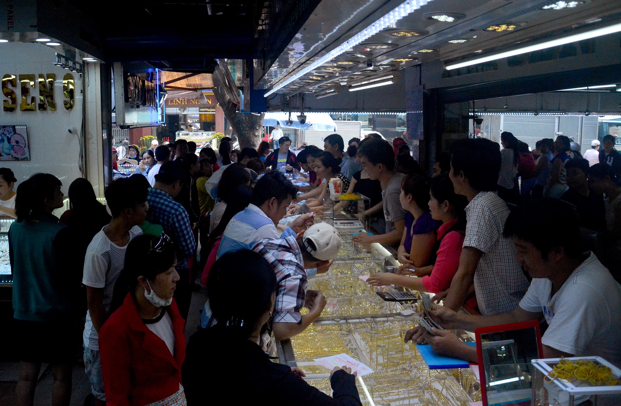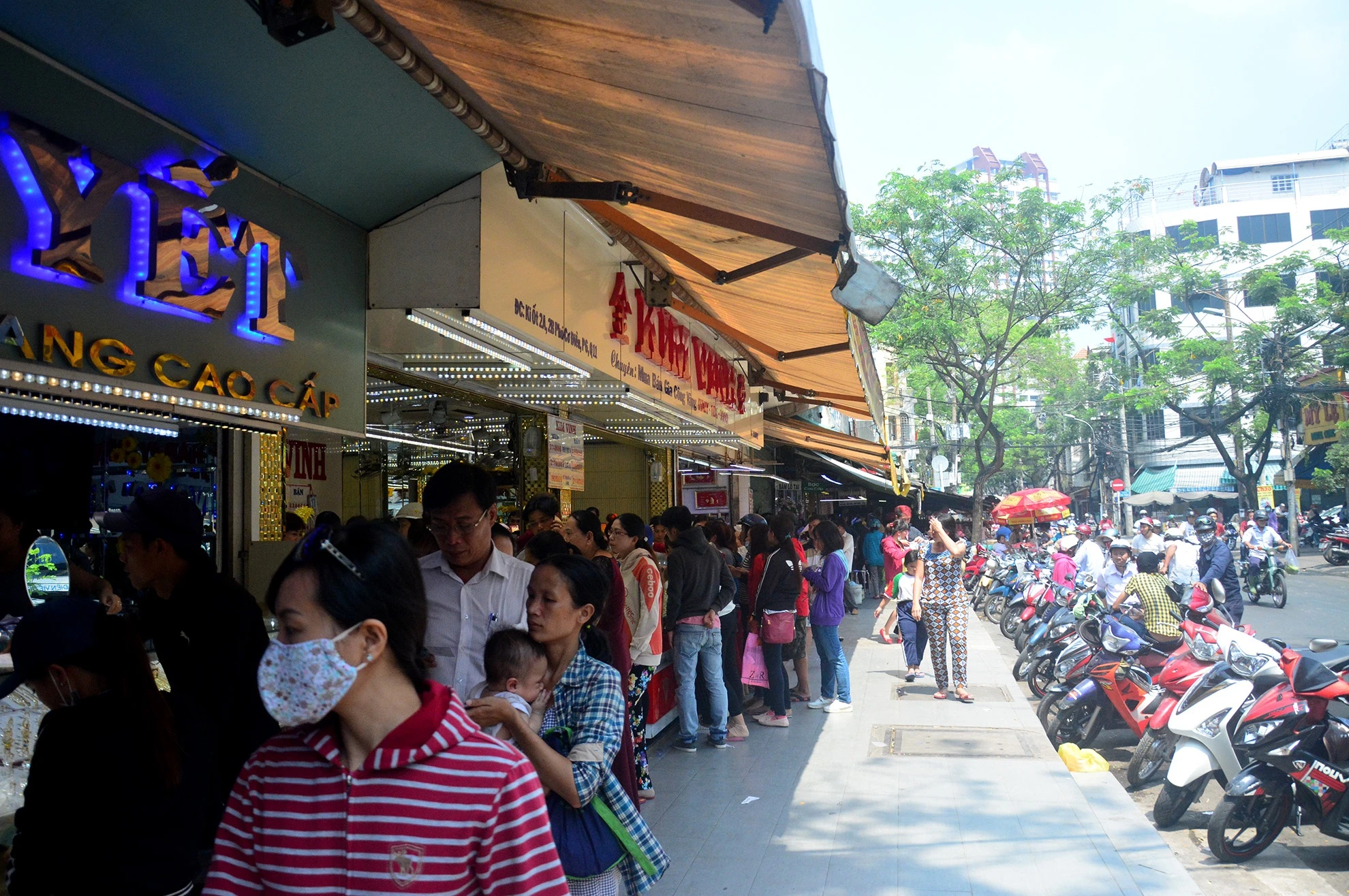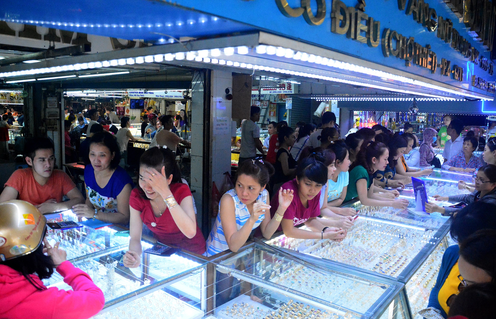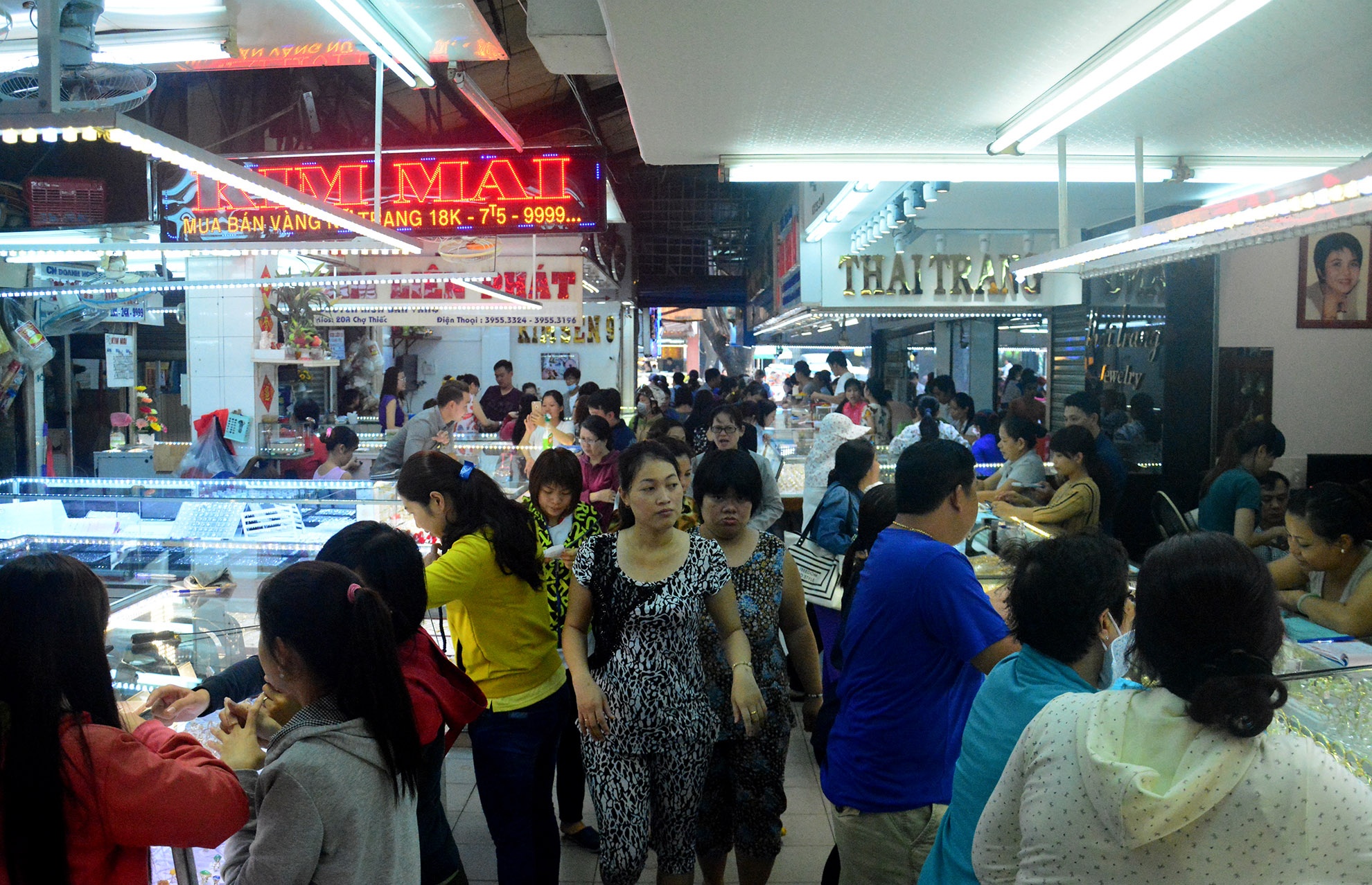 | Chợ Thiếc là điểm kinh doanh vàng bạc lớn tại quận 11, nơi có đông người Hoa sinh sống. Chủ tiệm vàng Kim Sen cho biết, cửa hàng mở cửa sớm hơn ngày thường 1 tiếng đồng hồ, nhưng khách đã chờ sẵn từ trước. |
