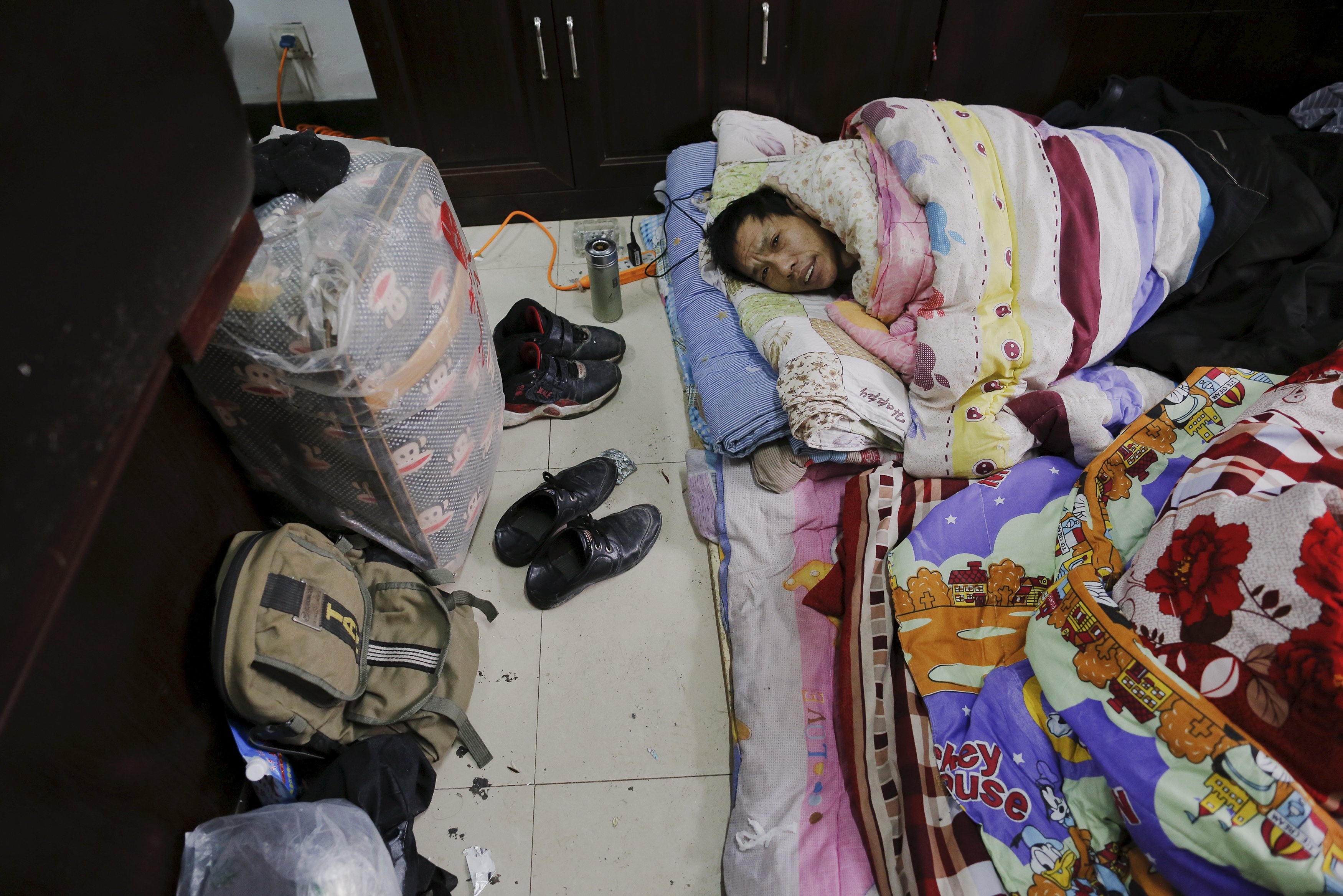 Một công nhân nhập cư ngủ trong văn phòng tại khu công trình xây dựng Zixia Garden ở Thiên An, tỉnh Hà Bắc. Ảnh: Reuters |