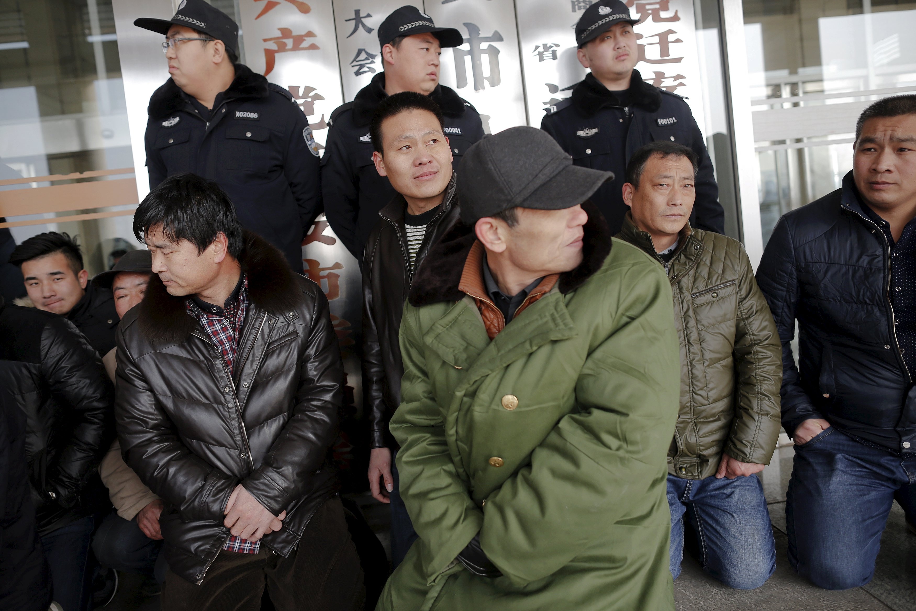 Người lao động nhập cư ngồi phản đối trước văn phòng chính quyền địa phương ở Thiên An, Hà Bắc. Ảnh: Reuters |