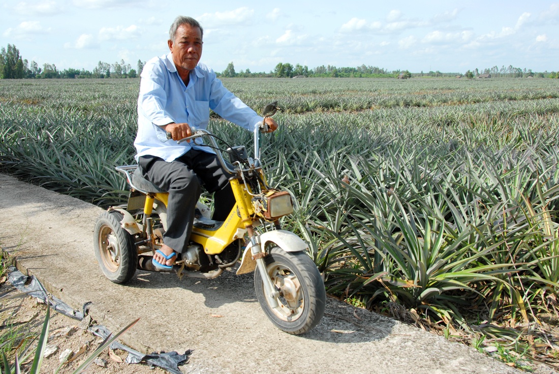 | Diện tích rộng bạt ngàn, ông Thanh hàng ngày thường đi thăm ruộng khóm bằng xe gắn máy. |