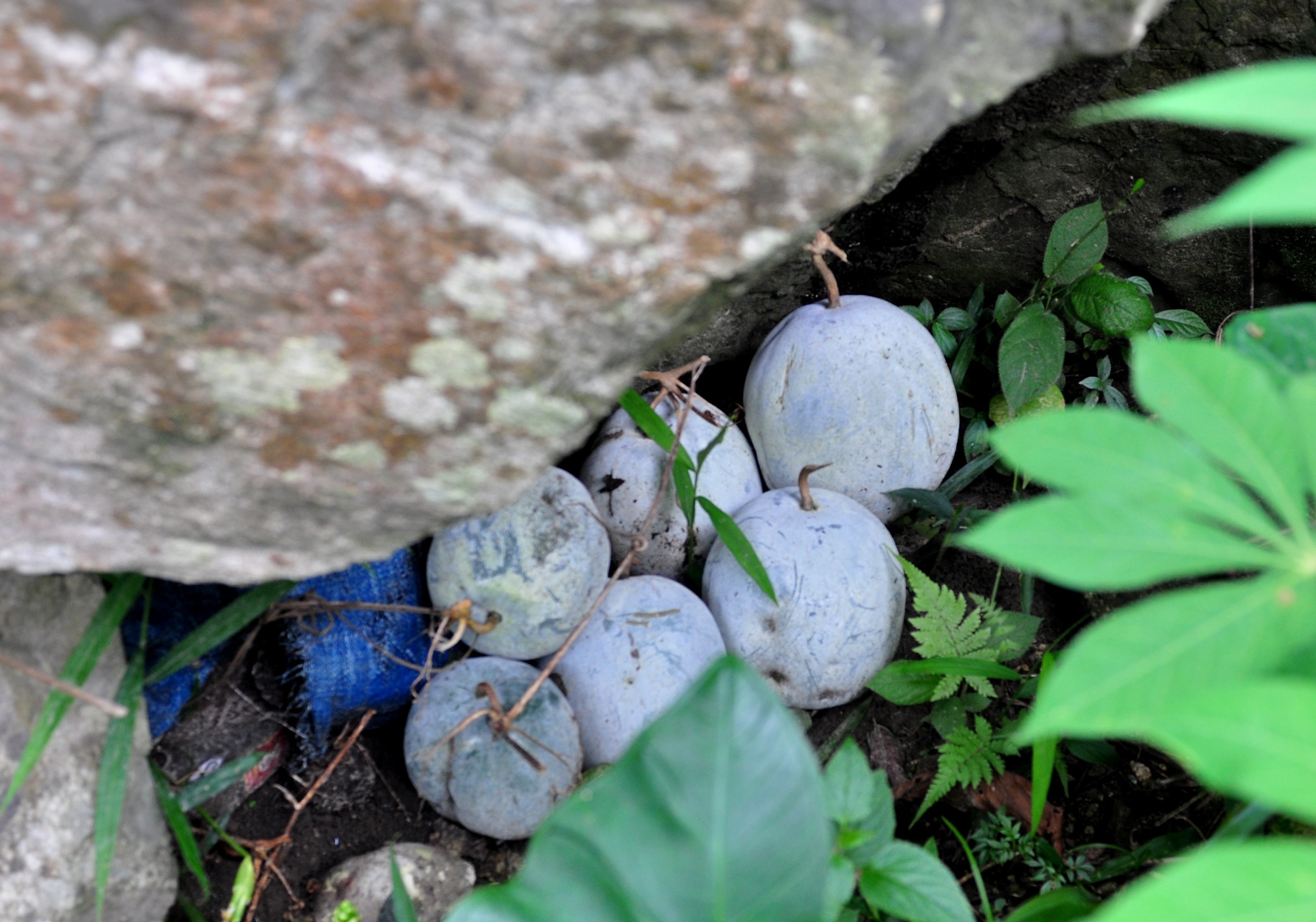 | Do căn chòi chật hẹp, sau khi thu hoạch, ông Châu để một số loại quả ngoài hốc đá để ăn dần. Ảnh: Minh Hoàng. |