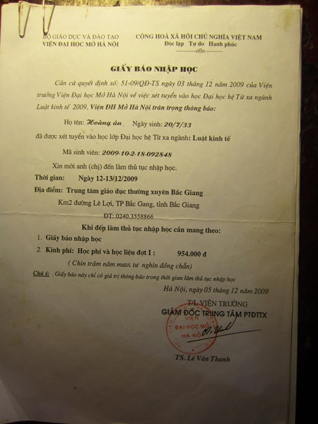 | Giấy báo nhập học của cụ Ân vào năm 2009. |