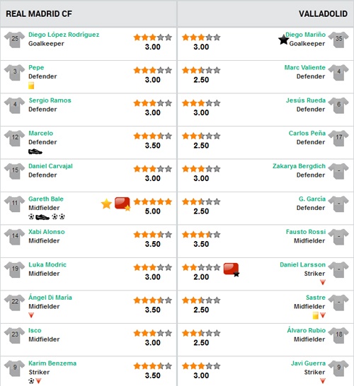 Điểm của cầu thủ ra sân trong đội hình chính trận Real - Valladolid