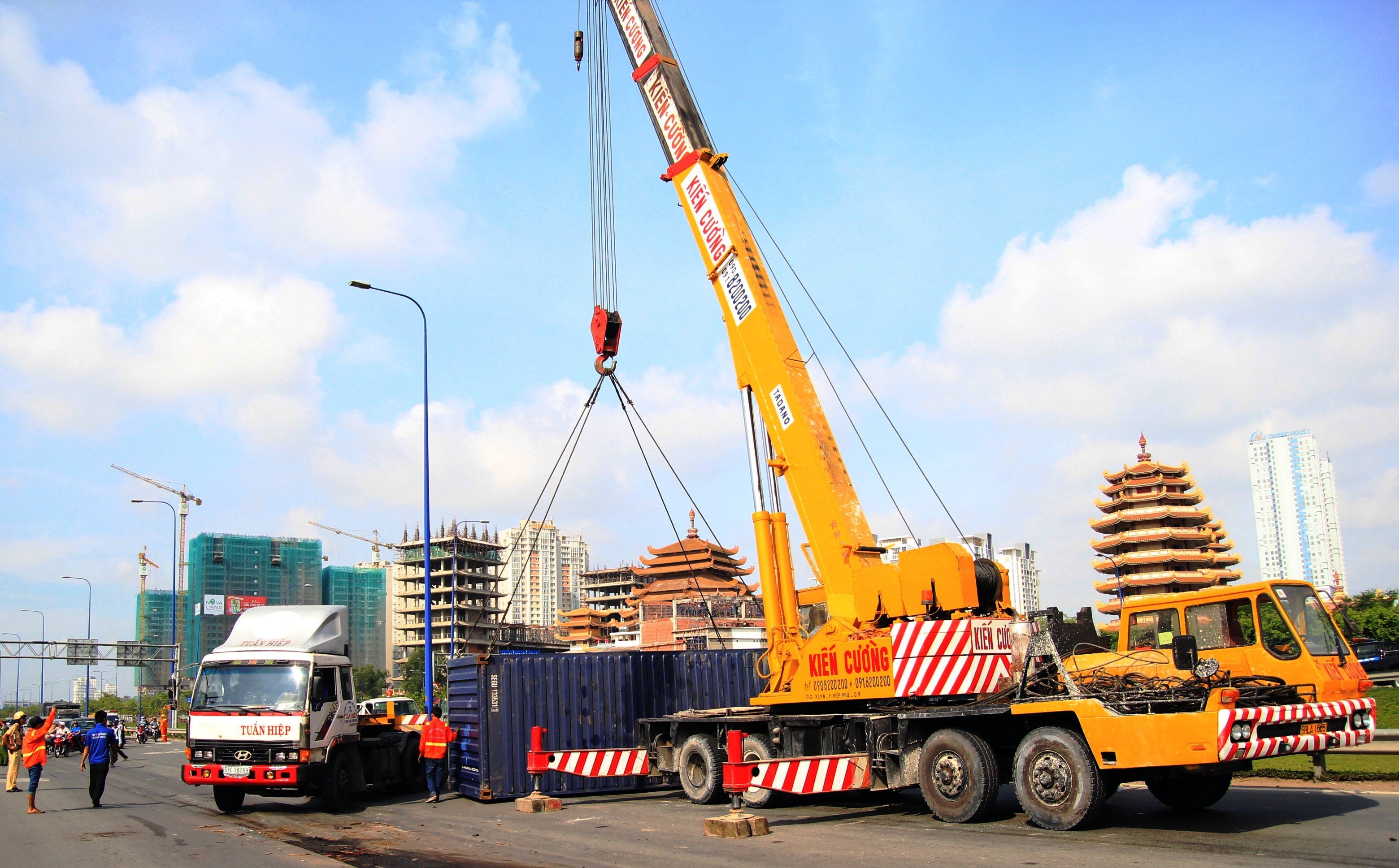 Lật container trên đại lộ nghìn tỷ ở Sài Gòn