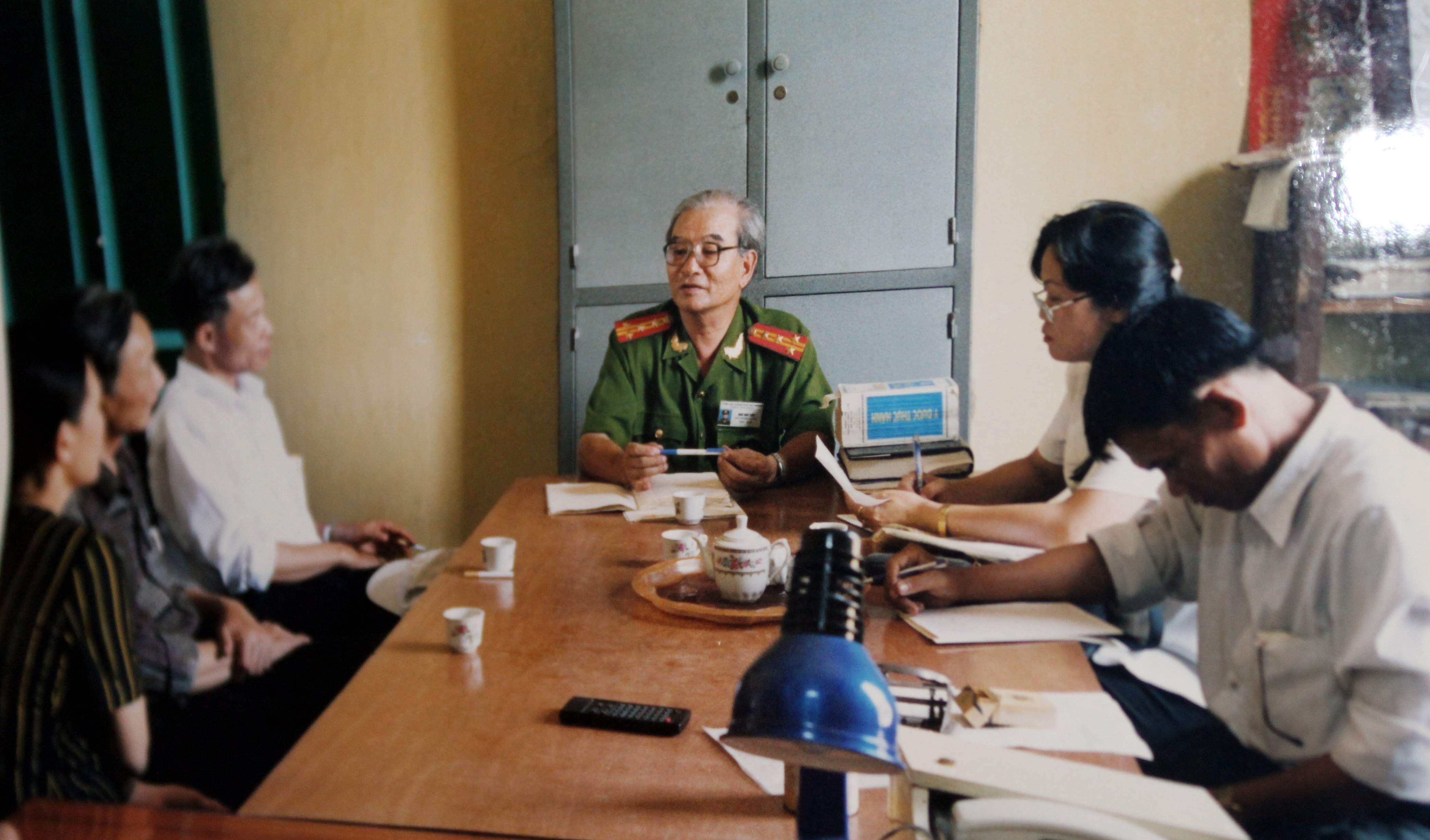 | Đại tá Tiếp trong cuộc họp chuyên môn cùng đồng nghiệp |