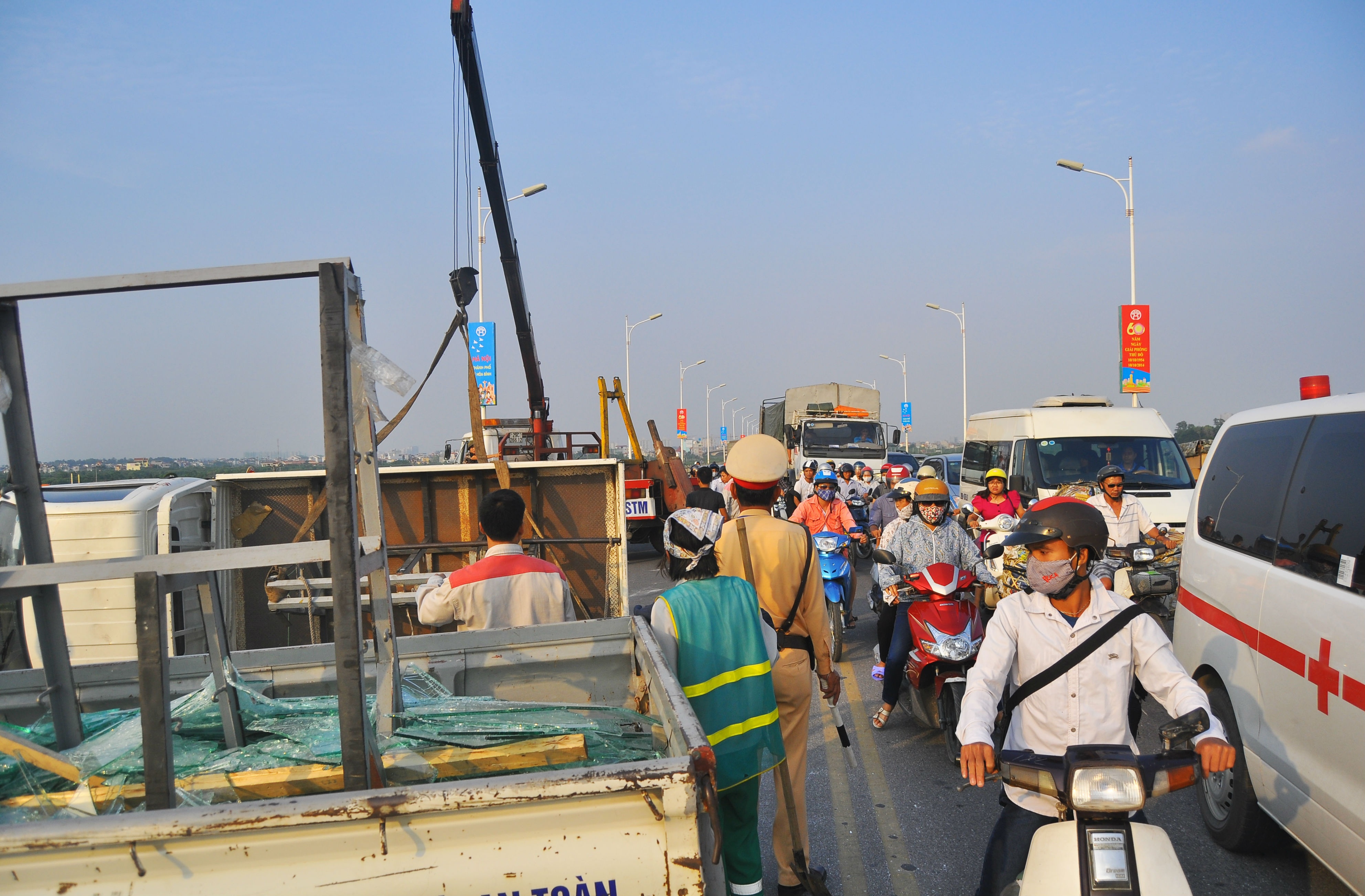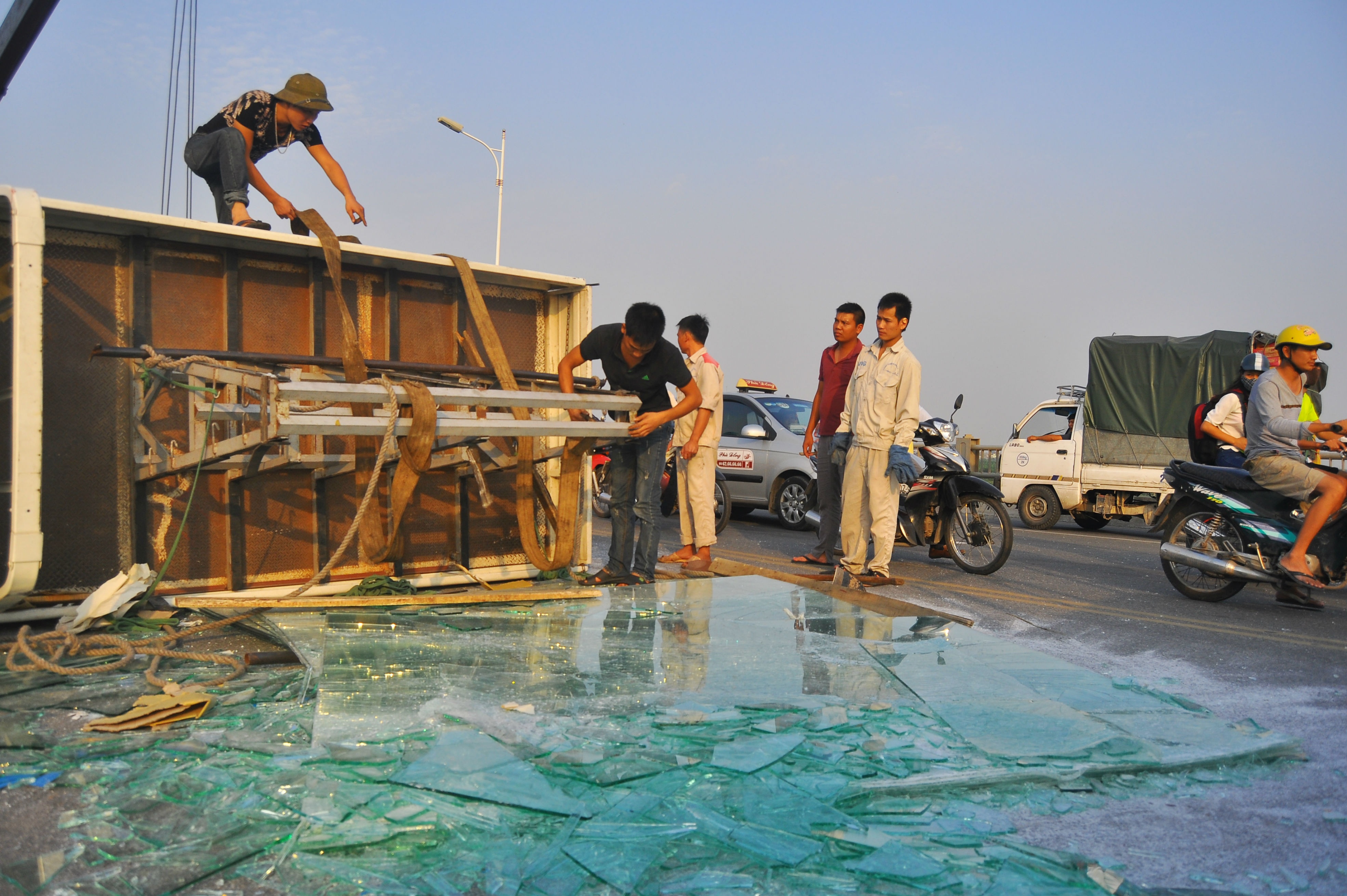 | Một nhân chứng cho hay, các tấm kính được buộc dựng đứng vào một khung sắt gắn giữa thùng xe. Chiếc xe này đi với tốc độ khá nhanh tới giữa cầu thì mất lái tự lật, tài xế bị thương nặng. Các tấm kính rơi vỡ dưới đường khiến nhiều phương tiện không dám đi qua gây ùn tắc kéo dài. |