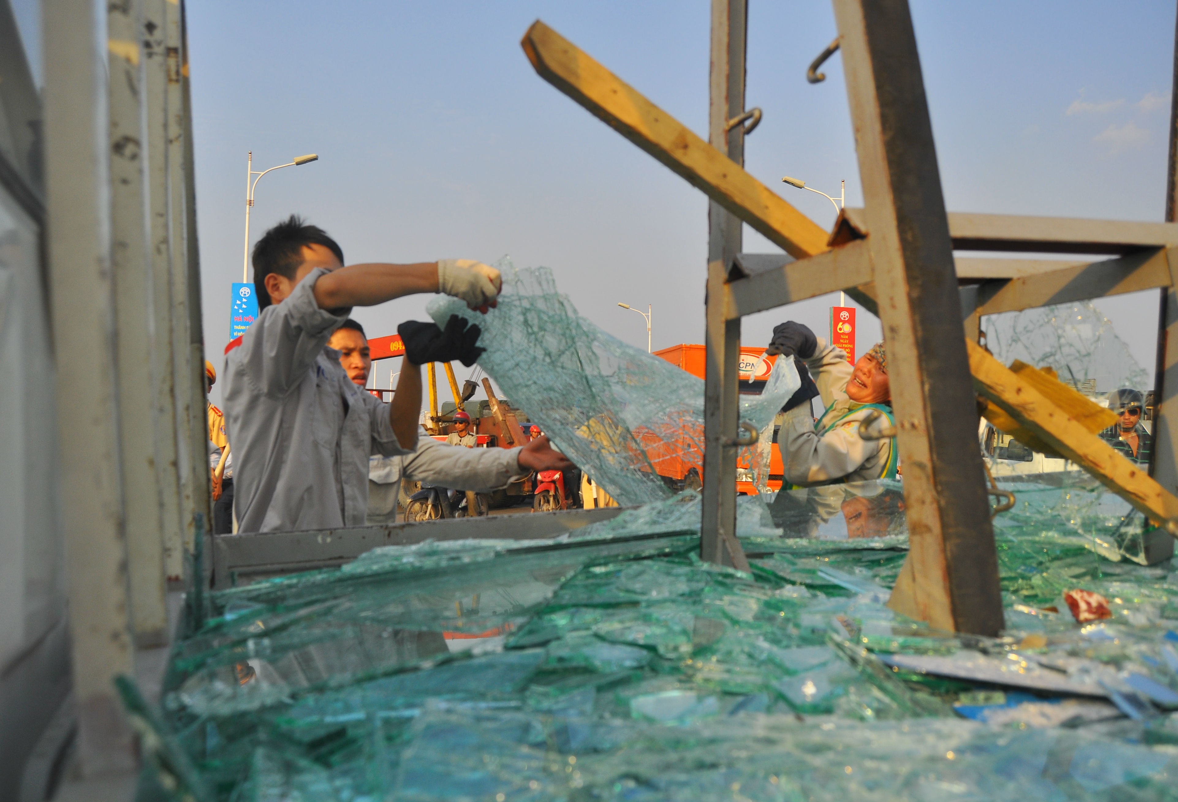 | Một nhân viên cứu hộ cho hay, số vật liệu này đa số là kính không chống rạn nứt nên vỡ thành nhiều mảnh sắc nhọn. Nếu các phương tiện lưu thông qua không cẩn thận sẽ bị thủng lốp. |