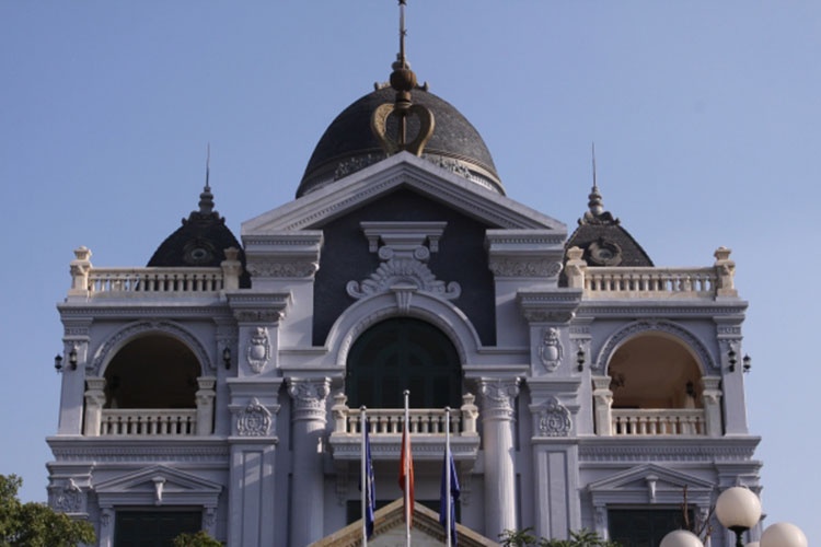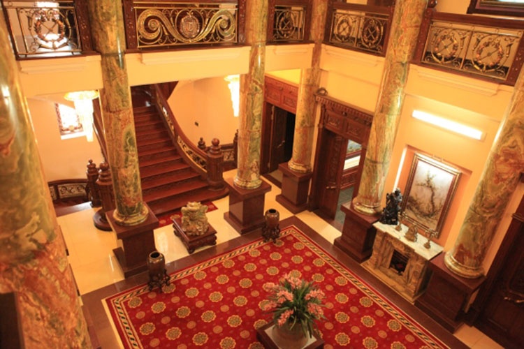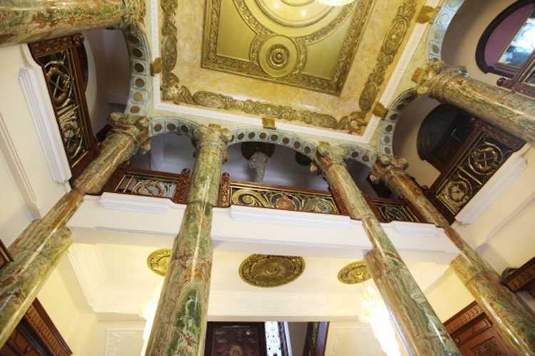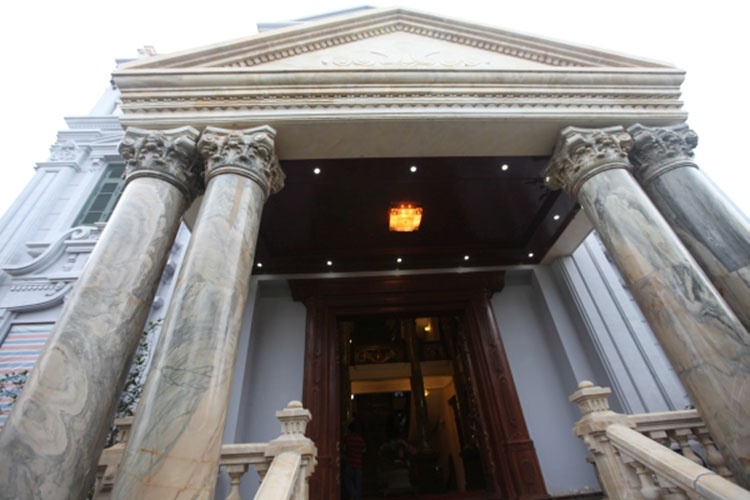 | Tòa nhà có thiết kế cổ điển đặc trưng với mái vòm, cột đá, cầu thang lượn, hoa văn trang trí phía ngoài tinh xảo. |