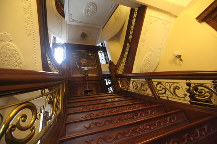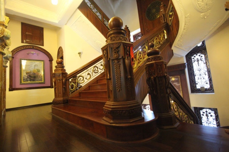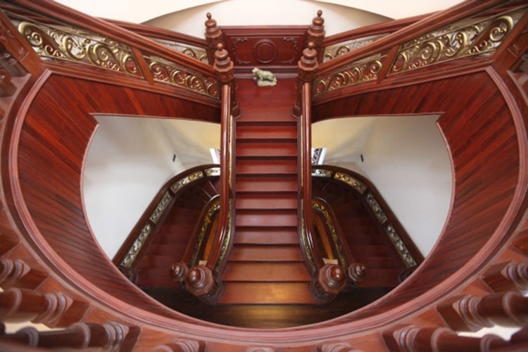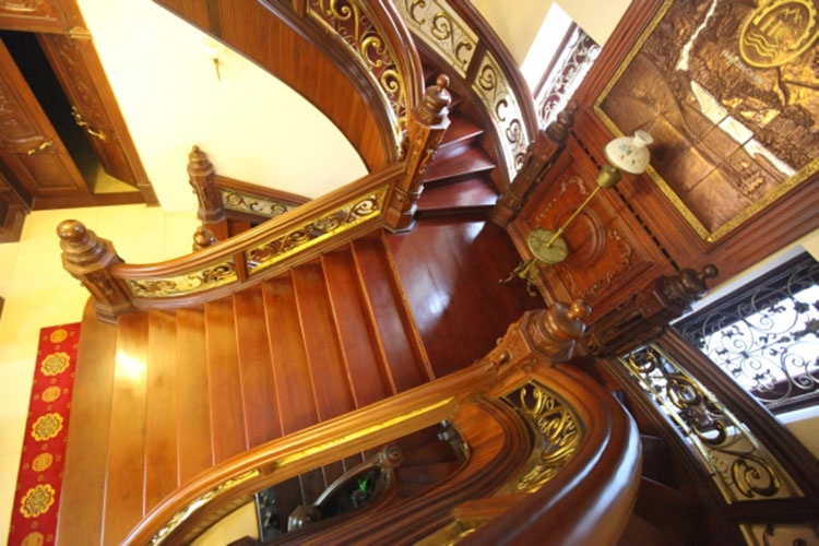 | Cầu thang được làm bằng gỗ, chạm khắc cột trụ tinh xảo. |