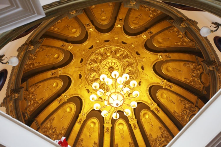 | Đèn vàng làm tăng thêm sự tráng lệ của mái vòm màu đồng. |